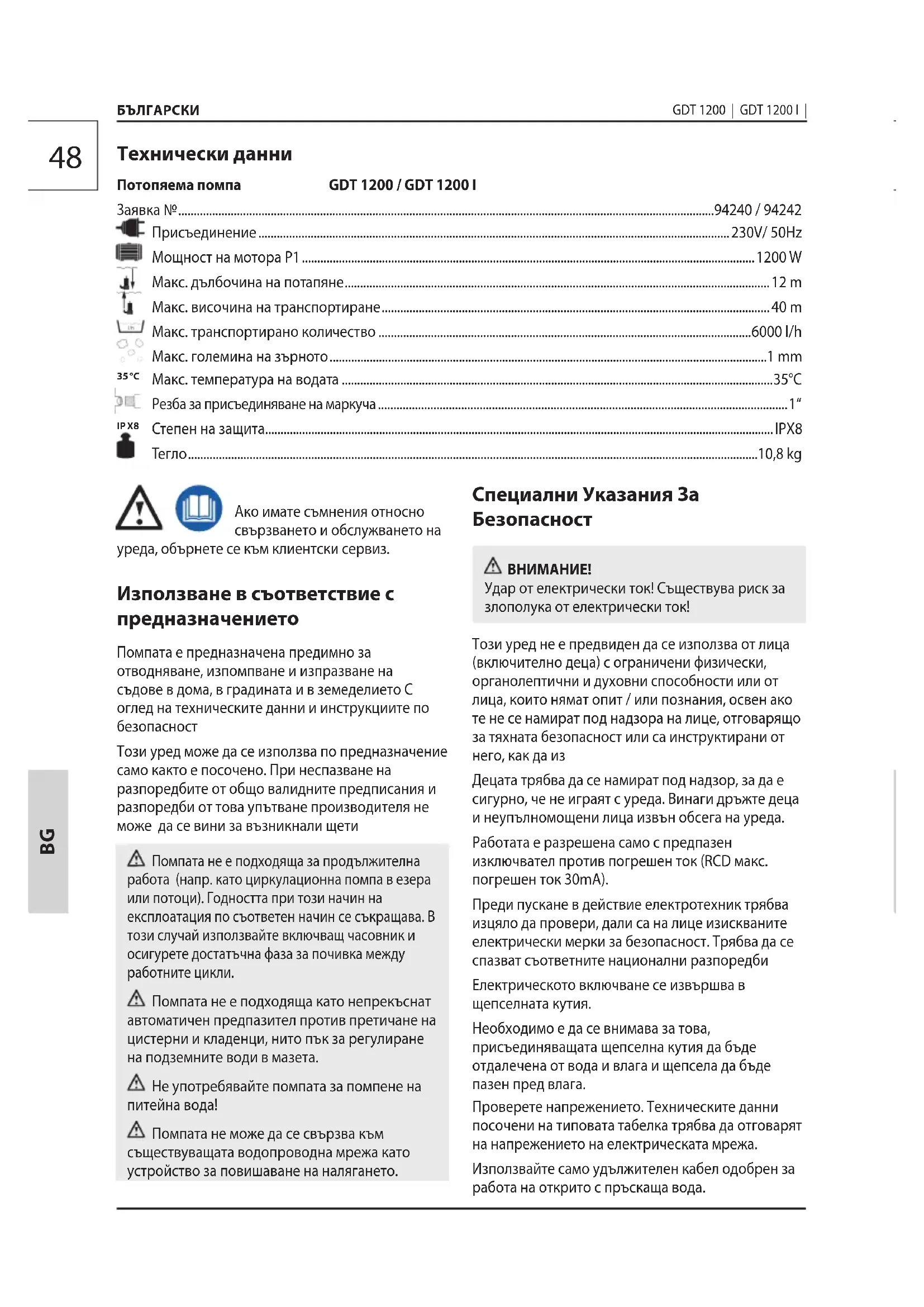 Ако имате съмнения относно свързването и обслужването на уреда, обърнете се към клиентски сервиз. Използване в съответствие с предназначението Помпата е предназначена предимно за отводняване, изпомпване и изпразване на съдове в дома, в градината и в земеделието С оглед на техническите данни и инструкциите по безопасност Този уред може да се използва по предназначение само както е посочено. При неспазване на разпоредбите от общо валидните предписания и разпоредби от това упътване производителя не може да се вини за възникнали щети Помпата не е подходяща за продължителна работа (напр. като циркулационна помпа в езера или потоци). Годността при този начин на експлоатация по съответен начин се съкращава. В този случай използвайте включващ часовник и осигурете достатъчна фаза за почивка между работните цикли. Помпата не е подходяща като непрекъснат автоматичен предпазител против претичане на цистерни и кладенци, нито пък за регулиране на подземните води в мазета. Не употребявайте помпата за помпене на питейна вода! Помпата не може да се свързва към съществуващата водопроводна мрежа като устройство за повишаване на налягането. Технически данни Потопяема помпа GDT 1200 / GDT 1200 I Заявка № ..............................................................................................................................................................................94240 / 94242 Присъединение ......................................................................................................................................................... 230V/ 50Hz Мощност на мотора P1 ................................................................................................................................................... 1200 W Макс. дълбочина на потапяне ..........................................................................................................................................12 m Макс. височина на транспортиране ..............................................................................................................................40 m Макс. транспортирано количество .........................................................................................................................6000 l/h Макс. големина на зърното ..............................................................................................................................................1 mm Макс. температура на водата ............................................................................................................................................35°C Резба за присъединяване на маркуча .....................................................................................................................................1“ Степен на защита .....................................................................................................................................................................IPX8 Тегло .........................................................................................................................................................................................10,8 kg Специални Указания За Безопасност