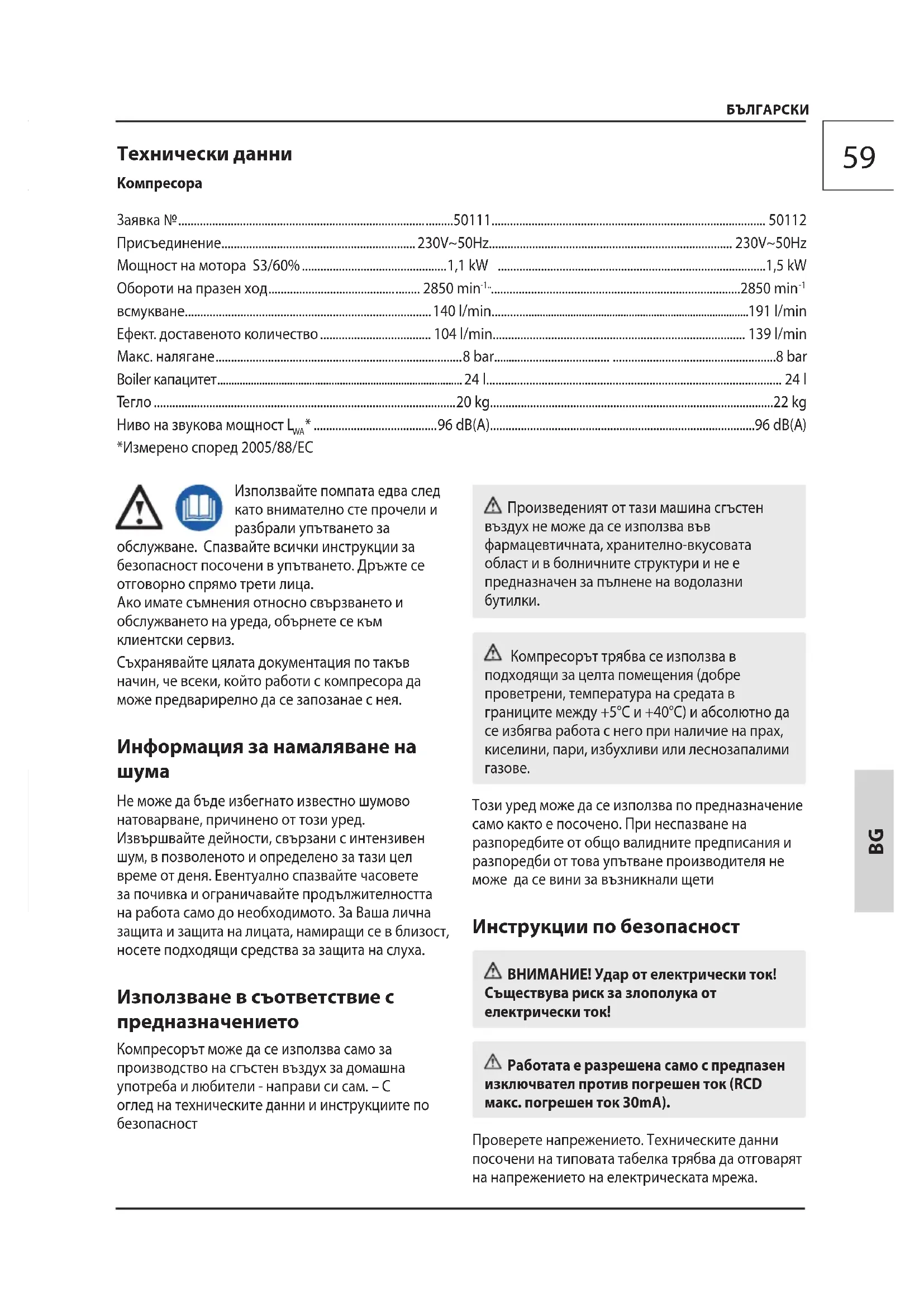 Не може да бъде избегнато известно шумово натоварване, причинено от този уред. Извършвайте дейности, свързани с интензивен шум, в позволеното и определено за тази цел време от деня. Евентуално спазвайте часовете за почивка и ограничавайте продължителността на работа само до необходимото. За Ваша лична защита и защита на лицата, намиращи се в близост, носете подходящи средства за защита на слуха. Използване в съответствие с предназначението Компресорът може да се използва само за производство на сгъстен въздух за домашна употреба и любители - направи си сам. – С оглед на техническите данни и инструкциите по безопасност