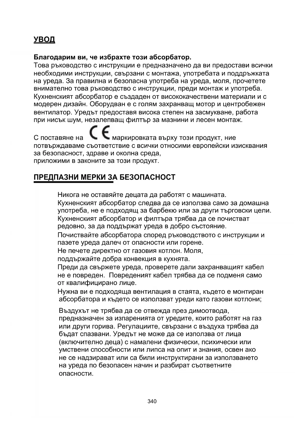 339УВОД Благодарим ви, че избрахте този абсорбатор. Това ръководство с инструкции е предназначено да ви предостави всички необходими инструкции, свързани с монтажа, употребата и поддръжката на уреда. За правилна и безопасна употреба на уреда, моля, прочетете внимателно това ръководство с инструкции, преди монтаж и употреба. Кухненският абсорбатор е създаден от висококачествени материали и с модерен дизайн. Оборудван е с голям захранващ мотор и центробежен вентилатор. Уредът предоставя висока степен на засмукване, работа при нисък шум, незалепващ филтър за мазнини и лесен монтаж. С поставяне на маркировката върху този продукт, ние потвърждаваме съответствие с всички относими европейски изисквания за безопасност, здраве и околна среда, приложими в законите за този продукт. ПРЕДПАЗНИ МЕРКИ ЗА БЕЗОПАСНОСТ Никога не оставяйте децата да работят с машината. Кухненският абсорбатор следва да се използва само за домашна употреба, не е подходящ за барбекю или за други търговски цели. Кухненският абсорбатор и филтъра трябва да се почистват редовно, за да поддържат уреда в добро състояние. Почиствайте абсорбатора според ръководството с инструкции и пазете уреда далеч от опасности или горене. Не печете директно от газовия котлон. Моля, поддържайте добра конвекция в кухнята. Преди да свържете уреда, проверете дали захранващият кабел не е повреден. Повреденият кабел трябва да се подменя само от квалифицирано лице. Нужна ви е подходяща вентилация в стаята, където е монтиран абсорбатора и където се използват уреди като газови котлони; Въздухът не трябва да се отвежда през димоотвода, предназначен за изпаренията от уредите, които работят на газ или други горива. Регулациите, свързани с въздуха трябва да бъдат спазвани. Уредът не може да се използва от лица (включително деца) с намалени физически, психически или умствени способности или липса на опит и знания, освен ако не се надзирават или са били инструктирани за използването на уреда по безопасен начин и разбират съответните