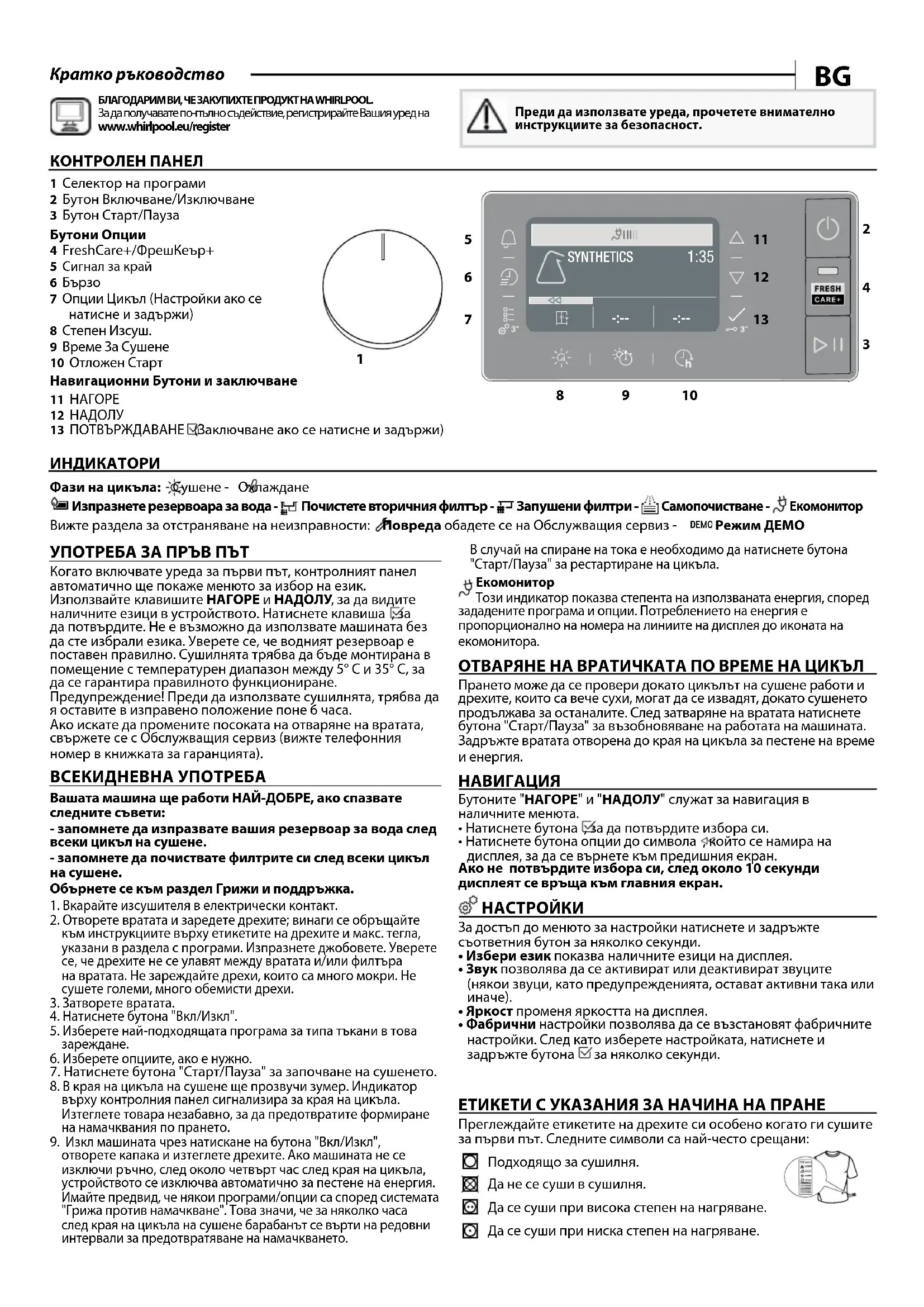 се повече енергия и може да настъпи повреда в сушилнята. Ако тези операции не се извършват правилно, сушилнята може да не стартира. Самопочистване Поддръжката на долния филтър на този модел е автоматична. Сушилнята извършва почистване, когато сензорите показват, че е необходимо. В този случай машината продължава да работи, дори ако цикълът на сушене е приключил. Индикатор на контролния панел ще сигнализира за поддръжка. Не изключвайте машината по време на тази фаза.БЛАГОДАРИМ ВИ, ЧЕ ЗАКУПИХТЕ ПРОДУКТ НА WHIRLPOOL. За да получавате по-пълно съдействие, регистрирайте Вашия уред на www.whirlpool.eu/register Фирмени политики, стандартна документация, поръчка на резервни части и допълнителна информация за продукти можете да намерите на: