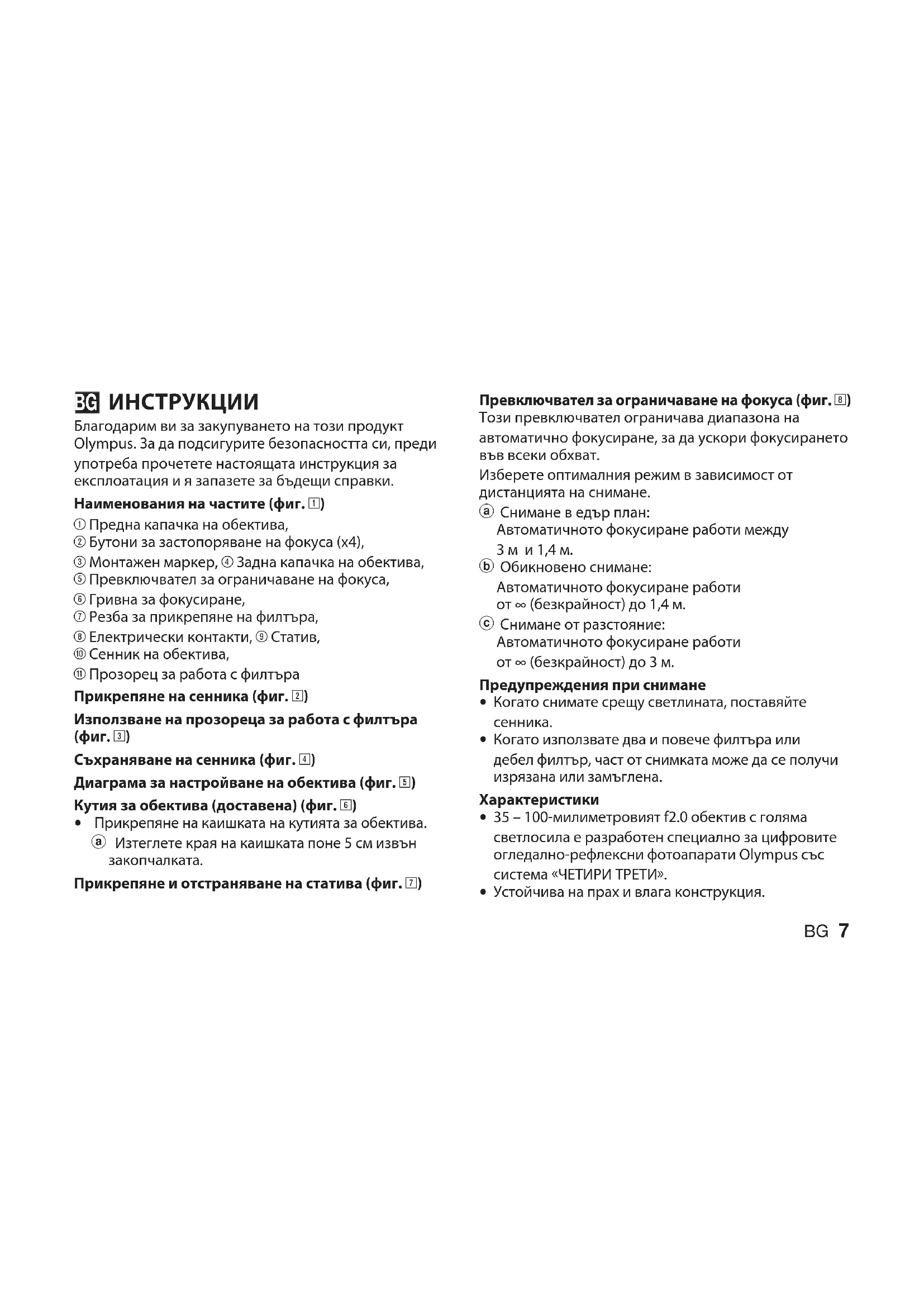 Благодарим ви за закупуването на този продукт Olympus. За да подсигурите безопасността си, преди употреба прочетете настоящата инструкция за експлоатация и я запазете за бъдещи справки. Наименования на частите (фиг. 1) 1 Предна капачка на обектива, 2 Бутони за застопоряване на фокуса (x4), 3 Монтажен маркер, 4 Задна капачка на обектива, 5 Превключвател за ограничаване на фокуса, 6 Гривна за фокусиране, 7 Резба за прикрепяне на филтъра, 8 Електрически контакти, 9 Статив, 0 Сенник на обектива, q Прозорец за работа с филтъра Прикрепяне на сенника (фиг. 2) Използване на прозореца за работа с филтъра (фиг. 3) Съхраняване на сенника (фиг. 4) Диаграма за настройване на обектива (фиг. 5) Кутия за обектива (доставена) (фиг. 6) Прикрепяне на каишката на кутията за обектива.