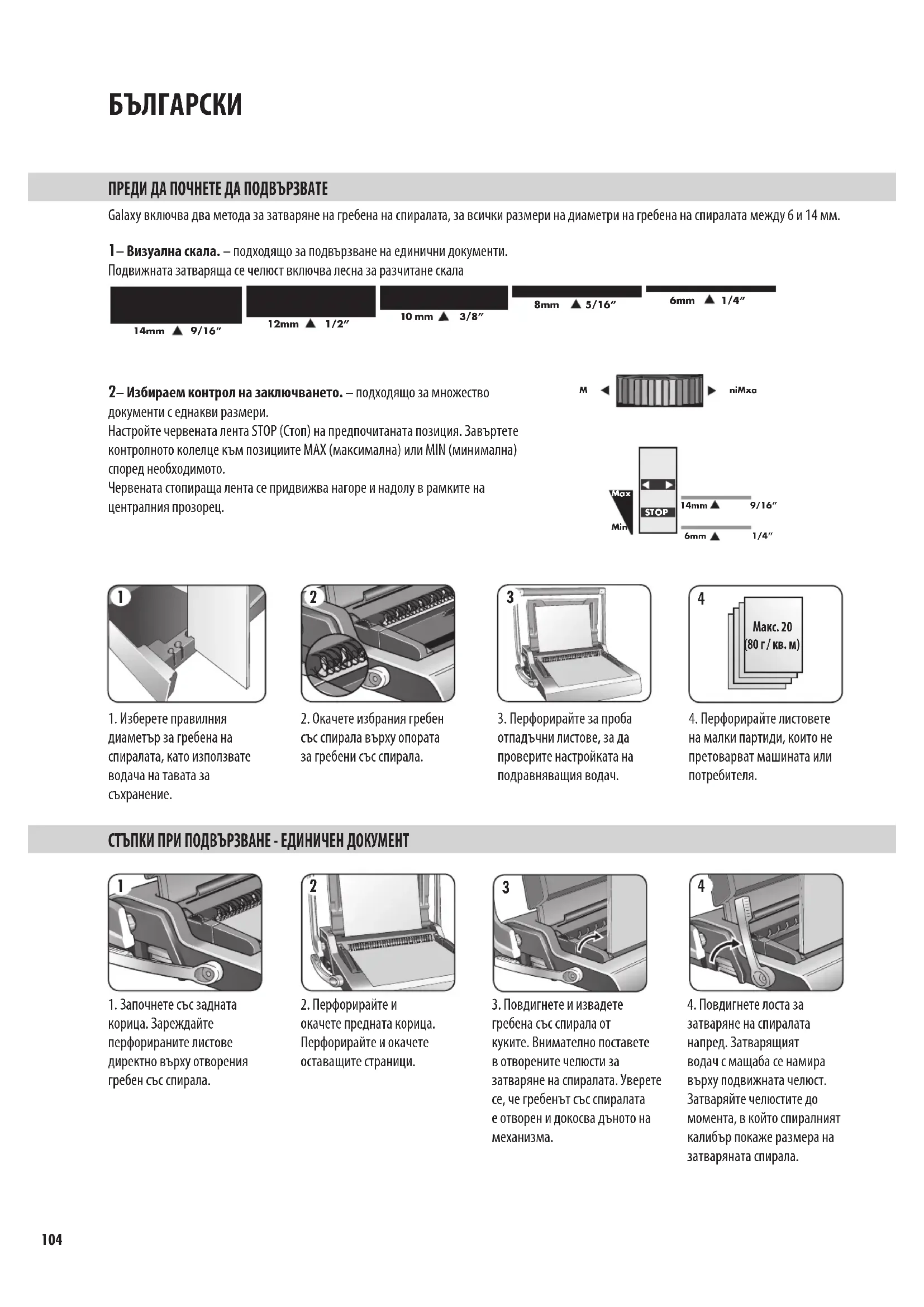 Galaxy включва два метода за затваряне на гребена на спиралата, за всички размери на диаметри на гребена на спиралата между 6 и 14 мм. 1– Визуална скала. – подходящо за подвързване на единични документи. Подвижната затваряща се челюст включва лесна за разчитане скала 6mm 1/4”8mm 5/16”10 mm 3/8”12mm 1/2”14mm 9/16” 2– Избираем контрол на заключването. – подходящо за множество документи с еднакви размери. Настройте червената лента STOP (Стоп) на предпочитаната позиция. Завъртете контролното колелце към позициите MAX (максимална) или MIN (минимална) според необходимото. Червената стопираща лента се придвижва нагоре и надолу в рамките на централния прозорец. ПРЕДИ ДА ПОЧНЕТЕ ДА ПОДВЪРЗВАТЕ