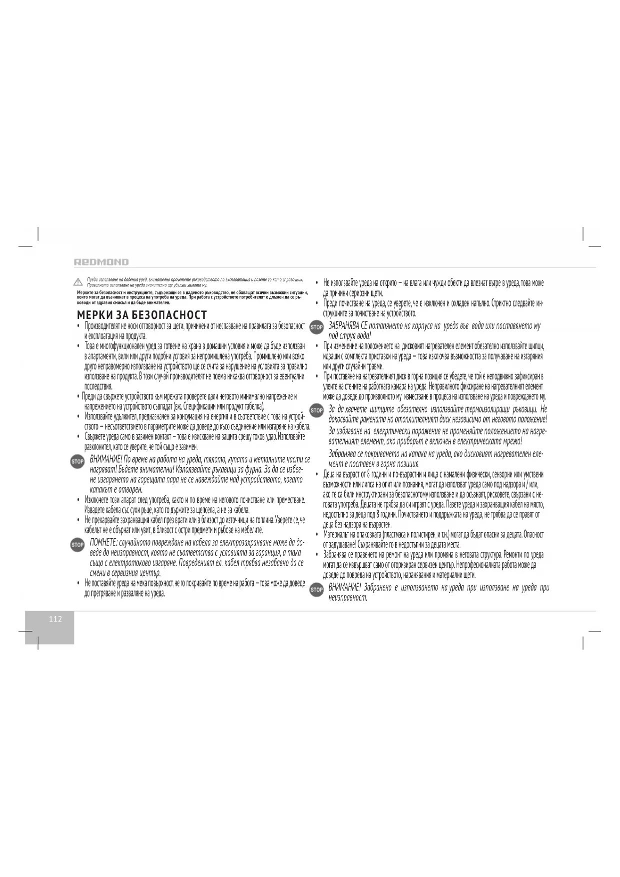 Проверете състоянието на уплътнителната гума върху вътрешния капак на уреда. Може би тя трябва да бъде сменена. В случай, че неизправността не може да се отстрани, обърнете се към авторизирания сервизен център. Екологично безвредна утилизация (утилизация на електрическо и електронно оборудване) Изхвърлянето на опаковката, ръководствата, както и самият уредът трябва да се извърши в съответствие с мест- ните програми за рециклиране. Проявете загриженост за околната среда и не изхвърляйте тези продукти с обикновените битови отпадъци. Използваните (стари) уреди не трябва да се изхвърлят с другите битови отпадъци, те трябва да се утилизират от- делно. Собствениците на старо оборудване трябва да отнесат уредите в специалните пунктове за събиране на такива отпадъци или да ги предадат в съответните организации. Така ще подпомогнете програмата за преработка на ценни суровини, както и за пречистване на замърсяващи вещества. Даденият прибор е произведен в съответствие с Европейските директиви 2012/19/EU, регулиращи използването на електри- чески електронни уреди. Дадената директива определя основните изисквания за използване ипреработка на отпадъците от електрическите електрон- ни прибори, действащи на територията на целия Европейски Съюз.120 Prije korištenja ovog proizvoda, pažljivo pročitajte upute za uporabu i zadržite ga kao podsjetnik. Pravilna uporaba višenamjenskog uređaja će znatno produžiti njegovo trajanje. Mjere opreza i instrukcije sadržane u ovim uputama ne obuhvaćaju sve moguće situacije koje mogu nastati pri rukovanju uređajem. Pri korištenju uređaja korisnik treba se rukovoditi zdravim razmišljanjem, biti oprezan i pažljiv. МJERE SIGURNOSTI