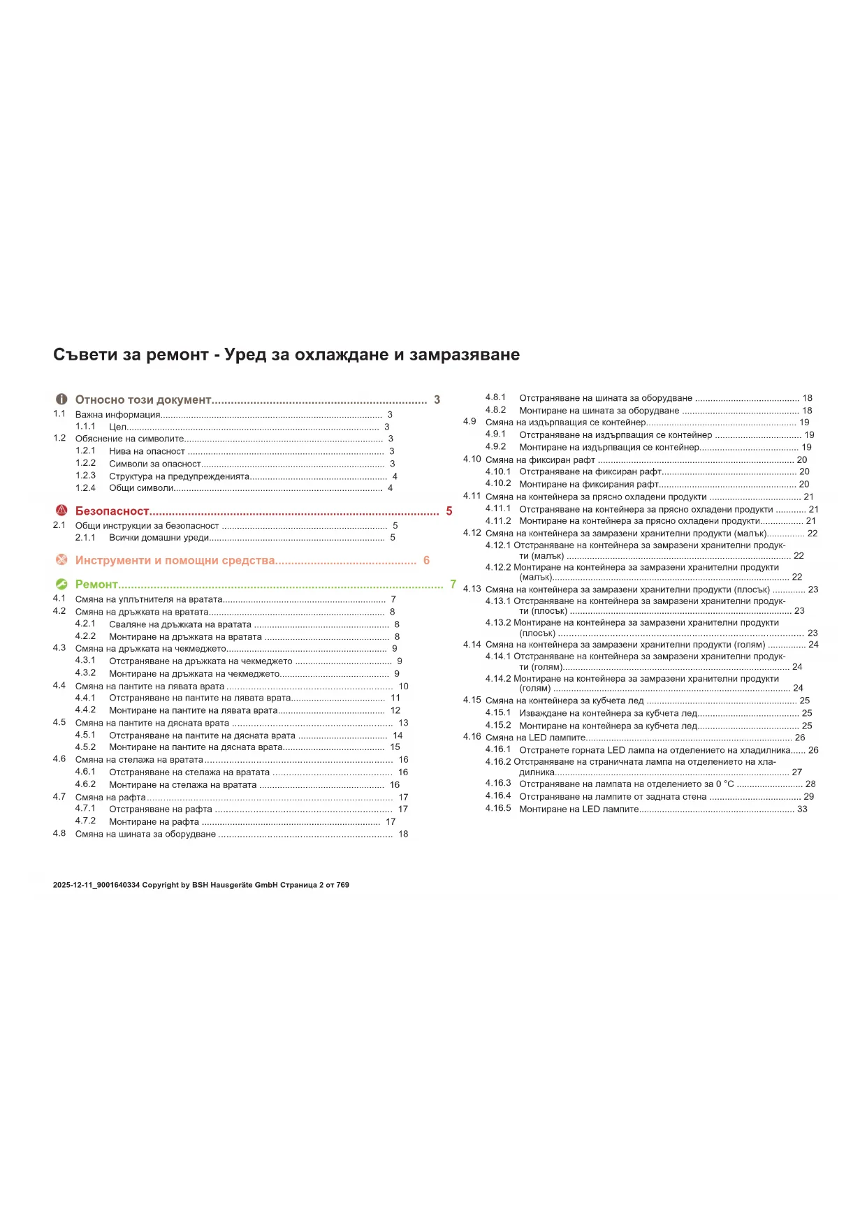 Монтиране на LED лампите.............................................................33 Съвети за ремонт-Уред за охлаждане и замразяване 2025-12-11_9001640334 Copyright by BSH Hausgeräte GmbH Страница2от769Относно този документ