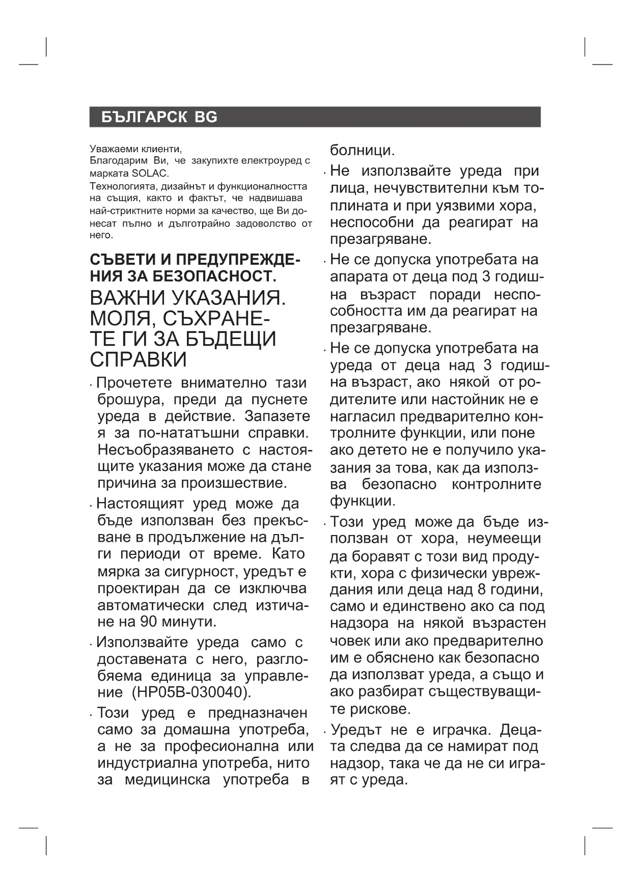 - По съображения на сигурност, настоящият уред е програмиран да се изключва авто- матично след 90 минути непрекъсната упо- треба. В случай, че уредът се изключи по горния начин и искате да се загрее отново, натиснете отново бутона за включване.