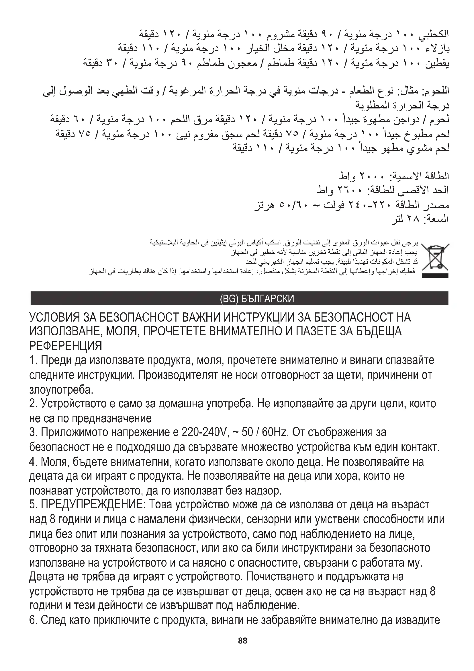 над 8 години и лица с намалени физически, сензорни или умствени способности или лица без опит или познания за устройството, само под наблюдението на лице, отговорно за тяхната безопасност, или ако са били инструктирани за безопасното използване на устройството и са наясно с опасностите, свързани с работата му. Децата не трябва да играят с устройството. Почистването и поддръжката на устройството не трябва да се извършват от деца, освен ако не са на възраст над 8 години и тези дейности се извършват под наблюдение. УСЛОВИЯ ЗА БЕЗОПАСНОСТ ВАЖНИ ИНСТРУКЦИИ ЗА БЕЗОПАСНОСТ НА ИЗПОЛЗВАНЕ, МОЛЯ, ПРОЧЕТЕТЕ ВНИМАТЕЛНО И ПАЗЕТЕ ЗА БЪДЕЩА
