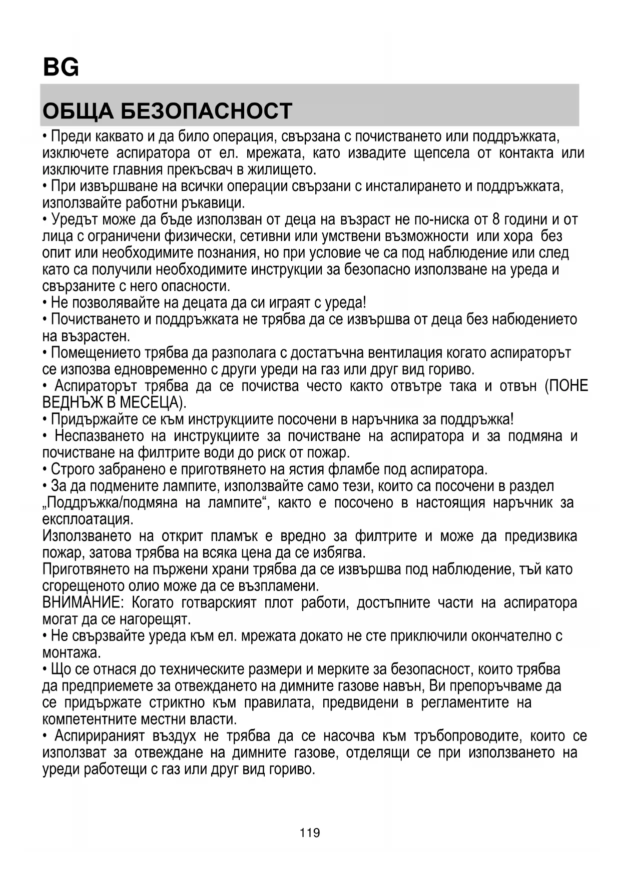- Неспазването на инструкциите за почистване на аспиратора и за подмяна и почистване на филтрите води до риск от пожар.