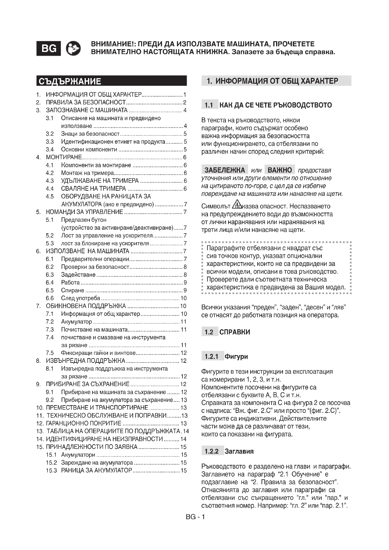 Ръководството е разделено на глави и параграфи. Заглавието на параграф “2.1 Обучение” е подзаглавие на “2. Правила за безопасност”. Отнасянията до заглавия или параграфи са отбелязани със съкращението "гл." или "пар." и съответния номер. Например: “гл. 2” или “пар. 2.1”.