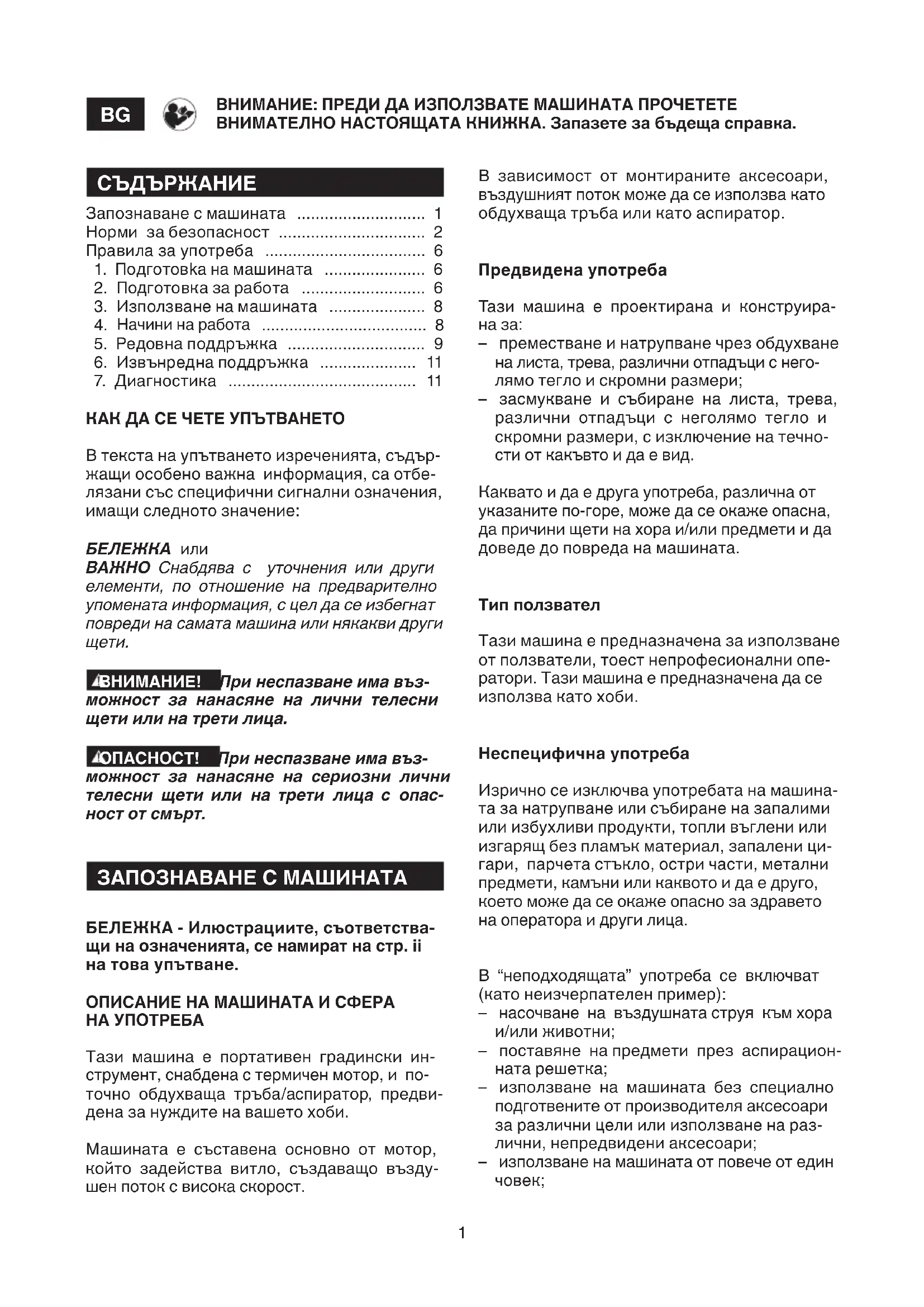 ВНИМАНИЕ! При неспазване има въз- можност за нанасяне на лични телесни щети или на трети лица. ОПАСНОСТ! При неспазване има въз- можност за нанасяне на сериозни лични телесни щети или на трети лица с опас- ност от смърт. ЗАПОЗНАВАНЕ С МАШИНАТА БЕЛЕЖКА - Илюстрациите, съответства- щи на означенията, се намират на стр. ii на това упътване. ОПИСАНИЕ НА МАШИНАТА И СФЕРА НА УПОТРЕБА Тази машина е портативен градински ин- струмент, снабдена с термичен мотор, и по- точно обдухваща тръба/аспиратор, предви- дена за нуждите на вашето хоби. Машината е съставена основно от мотор, който задейства витло, създаващо възду- шен поток с висока скорост. В зависимост от монтираните аксесоари, въздушният поток може да се използва като обдухваща тръба или като аспиратор. Предвидена употреба Тази машина е проектирана и конструира-
