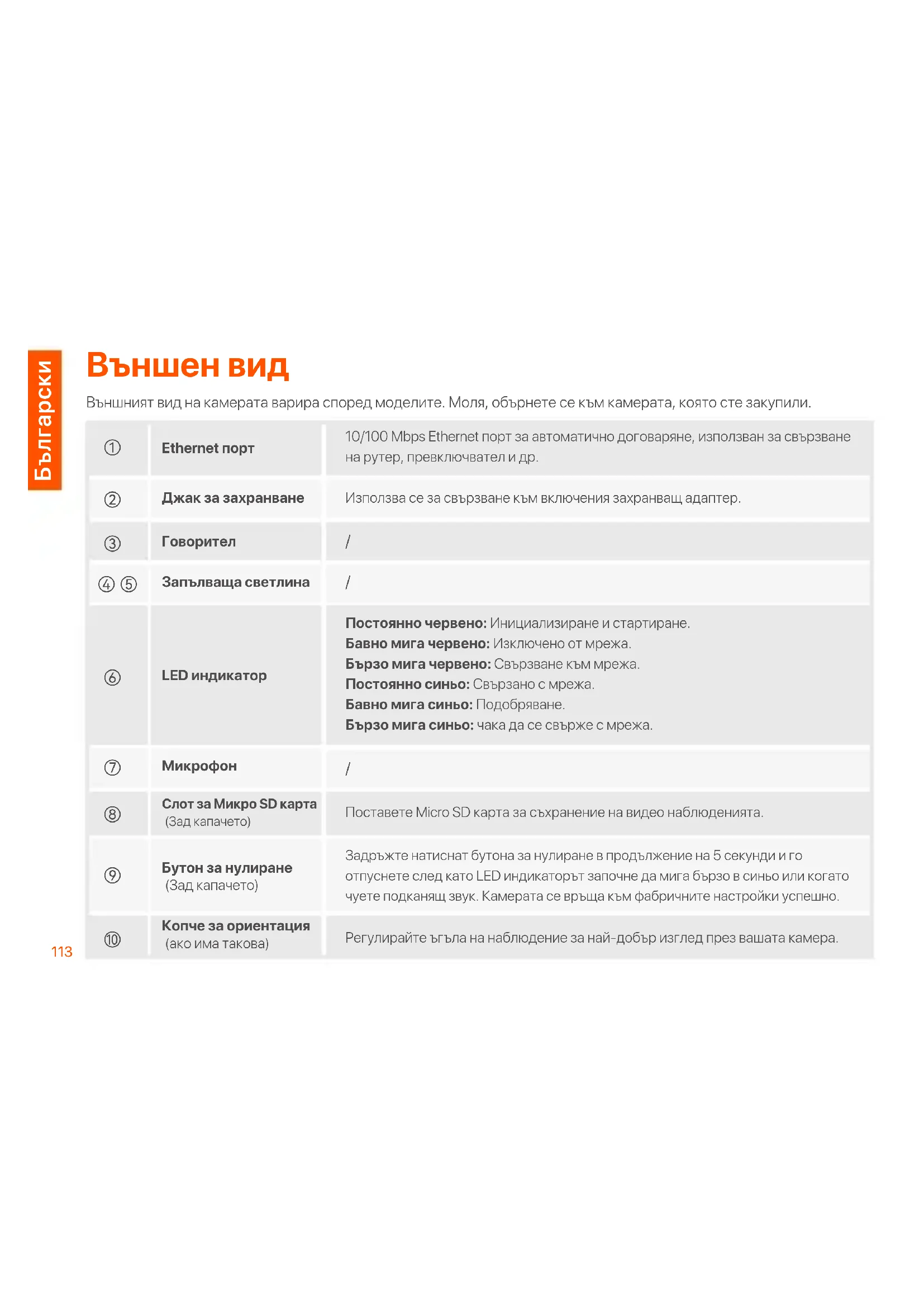 Използва се за свързване към включения заêранващ адаптер.10/100 Mbps Ethernet порт за автоматично договаряне, използван за свързване на рутер, превключвател и др.Постоянно червено: Инициализиране и стартиране.Бавно мига червено: Изключено от мрежа.Бързо мига червено: Свързване към мрежа.Постоянно синьо: Свързано с мрежа.Бавно мига синьо: Подобряване.Бързо мига синьо: чака да се свърже с мрежа.Поставете Micro SD карта за съêранение на видео наблюденията.Задръжте натиснат бутона за нулиране в продължение на 5 секунди и го отпуснете след като LED индикаторът започне да мига бързо в синьо или когато чуете подканящ звук. Камерата се връща към фабричните настройки успешно.Регулирайте ъгъла на наблюдение за най-добър изглед през вашата камера.Запълваща светлинаLED индикаторМикрофонГоворител