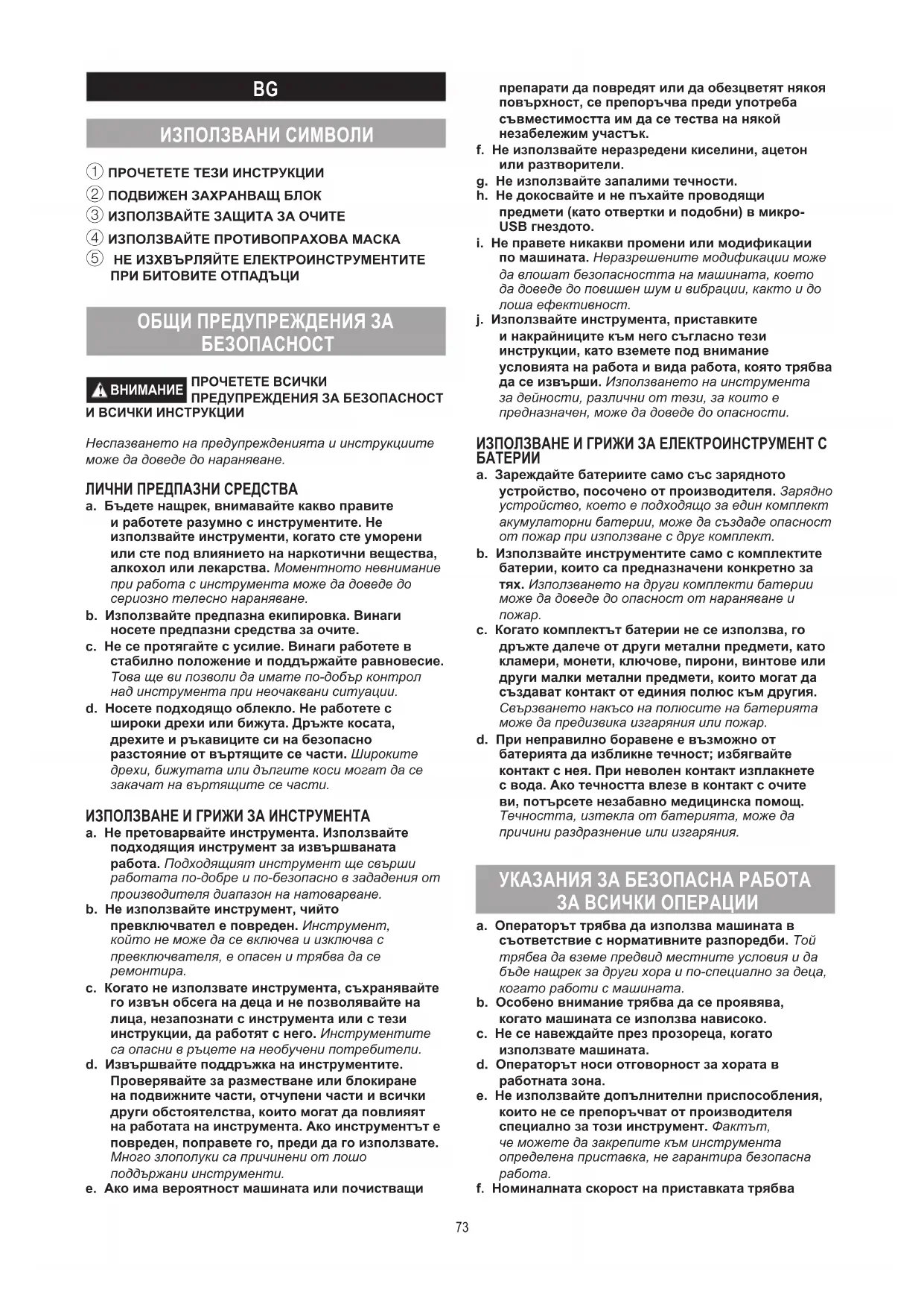 ВНИМАНИЕПРОЧЕТЕТЕ ВСИЧКИ ПРЕДУПРЕЖДЕНИЯ ЗА БЕЗОПАСНОСТ И ВСИЧКИ ИНСТРУКЦИИ Неспазването на предупрежденията и инструкциите може да доведе до нараняване. ЛИЧНИ ПРЕДПАЗНИ СРЕДСТВА a. Бъдете нащрек, внимавайте какво правите и работете разумно с инструментите. Не използвайте инструменти, когато сте уморени или сте под влиянието на наркотични вещества, алкохол или лекарства. Моментното невнимание при работа с инструмента може да доведе до сериозно телесно нараняване.b. Използвайте предпазна екипировка. Винаги носете предпазни средства за очите. c. Не се протягайте с усилие. Винаги работете в стабилно положение и поддържайте равновесие. Това ще ви позволи да имате по-добър контрол над инструмента при неочаквани ситуации.d. Носете подходящо облекло. Не работете с широки дрехи или бижута. Дръжте косата, дрехите и ръкавиците си на безопасно разстояние от въртящите се части. Широките дрехи, бижутата или дългите коси могат да се закачат на въртящите се части. ИЗПОЛЗВАНЕ И ГРИЖИ ЗА ИНСТРУМЕНТА a. Не претоварвайте инструмента. Използвайте подходящия инструмент за извършваната работа. Подходящият инструмент ще свърши работата по-добре и по-безопасно в зададения от производителя диапазон на натоварване.b. Не използвайте инструмент, чийто превключвател е повреден. Инструмент, който не може да се включва и изключва с превключвателя, е опасен и трябва да се ремонтира.c. Когато не използвате инструмента, съхранявайте го извън обсега на деца и не позволявайте на лица, незапознати с инструмента или с тези инструкции, да работят с него. Инструментите са опасни в ръцете на необучени потребители.d. Извършвайте поддръжка на инструментите. Проверявайте за разместване или блокиране на подвижните части, отчупени части и всички други обстоятелства, които могат да повлияят на работата на инструмента. Ако инструментът е повреден, поправете го, преди да го използвате. Много злополуки са причинени от лошо поддържани инструменти.e. Ако има вероятност машината или почистващи препарати да повредят или да обезцветят някоя повърхност, се препоръчва преди употреба съвместимостта им да се тества на някой незабележим участък.f. Не използвайте неразредени киселини, ацетон или разтворители.g. Не използвайте запалими течности.h. Не докосвайте и не пъхайте проводящи предмети (като отвертки и подобни) в микро-USB гнездото.i. Не правете никакви промени или модификации по машината. Неразрешените модификации може да влошат безопасността на машината, което да доведе до повишен шум и вибрации, както и до лоша ефективност.j. Използвайте инструмента, приставките и накрайниците към него съгласно тези инструкции, като вземете под внимание условията на работа и вида работа, която трябва да се извърши. Използването на инструмента за дейности, различни от тези, за които е предназначен, може да доведе до опасности. ИЗПОЛЗВАНЕ И ГРИЖИ ЗА ЕЛЕКТРОИНСТРУМЕНТ С