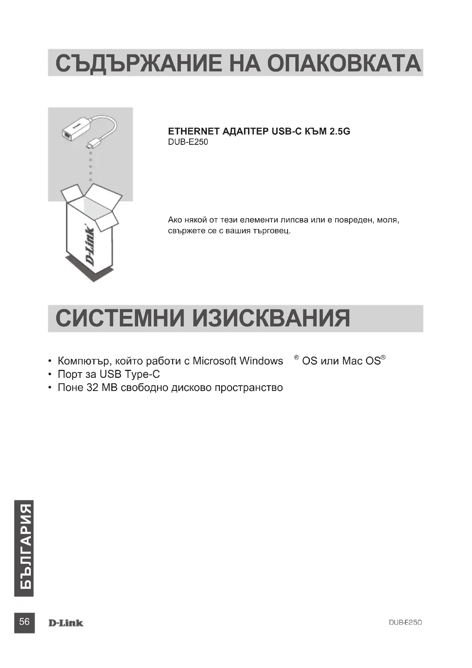 DUB-E250 Ако някой от тези елементи липсва или е повреден, моля, свържете се с вашия търговец. СЪДЪРЖАНИЕ НА ОПАКОВКАТА СИСТЕМНИ ИЗИСКВАНИЯ