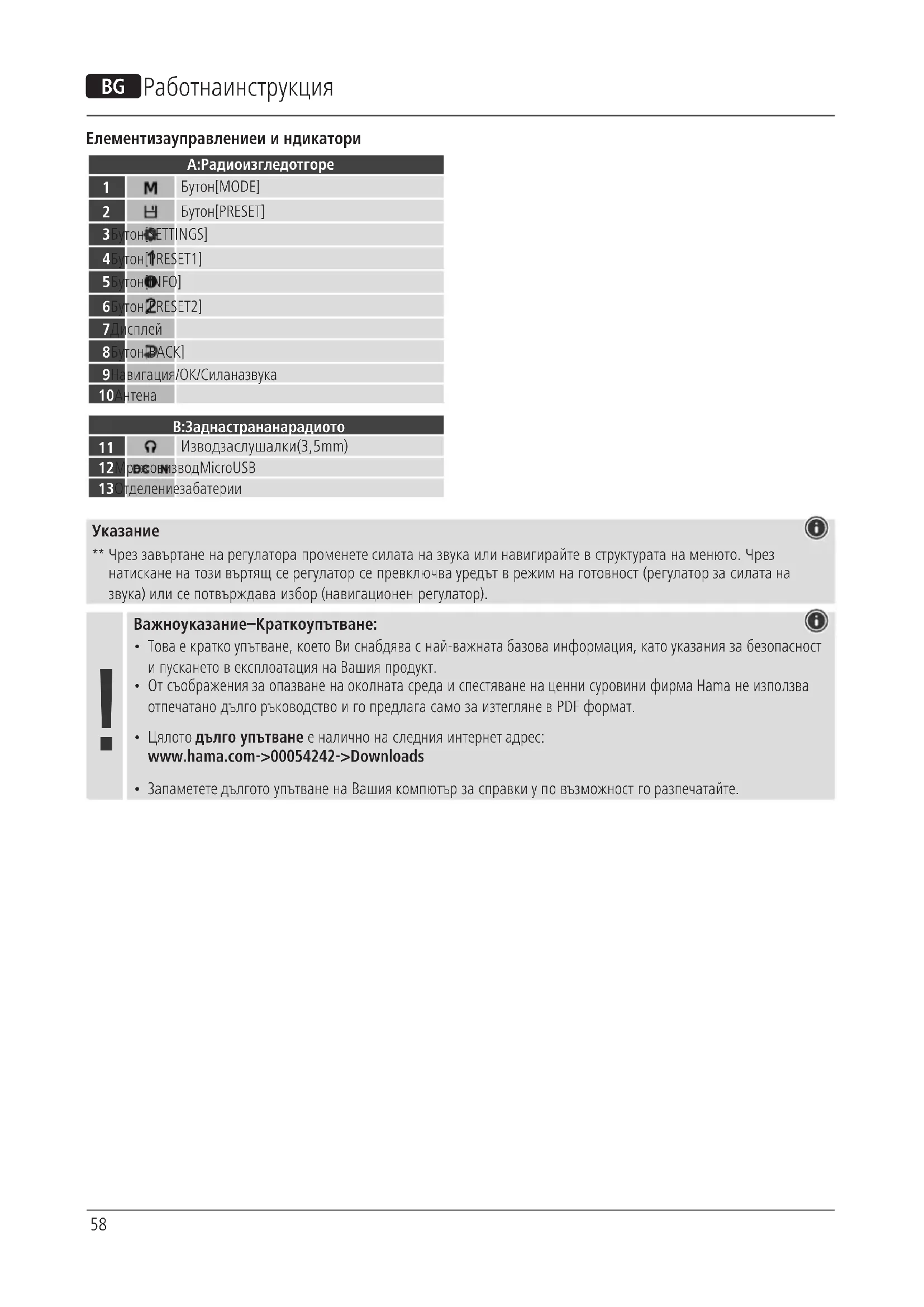 Hama GmbH &CoKGне поема отговорност или гаранция за повреди, които са резултат от неправилна инсталация, монтаж иупотреба на продукта или от неспазване на ръководството за експлоатация и/или на указанията за безопасност.61