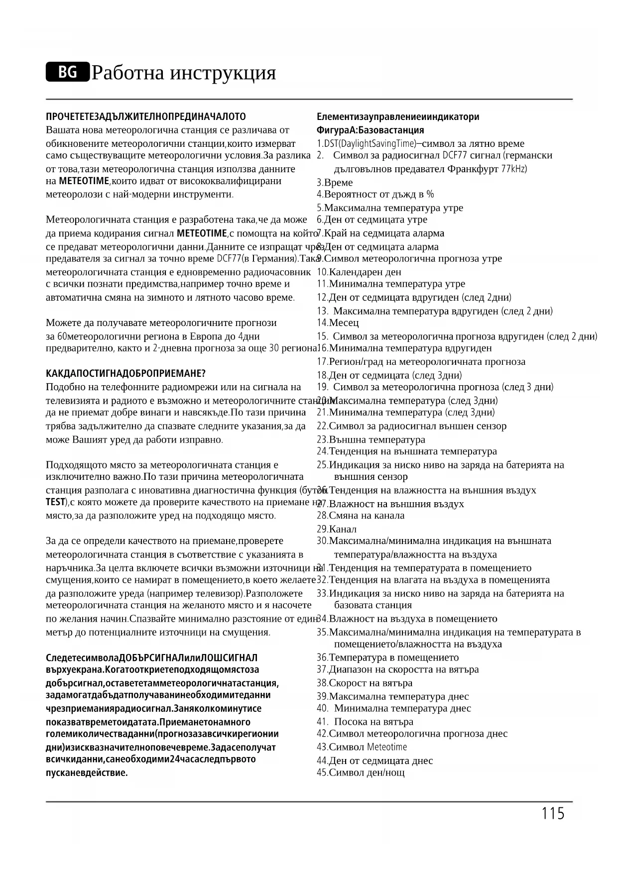 Downloads. Диапазон/диапазоны частот 433 МГц Максимальная излучаемая мощность 0,22 мВт115 B Работна инструкция ПРОЧЕТЕТЕ ЗАДЪЛЖИТЕЛНО ПРЕДИ НАЧАЛОТО Вашата нова метеорологична станция се различава от обикновените метеорологични станции, които измерват само съществуващите метеорологични условия. За разлика от това, тази метеорологична станция използва данните на METEOTIME, които идват от висококвалифицирани метеоролози с най-модерни инструменти. Метеорологичната станция е разработена така, че да може да приема кодирания сигнал METEOTIME, с помощта на който се предават метеорологични данни. Данните се изпращат чрез предавателя за сигнал за точно време DCF77 (в Германия). Така метеорологичната станция е едновременно радиочасовник с всички познати предимства, например точно време и автоматична смяна на зимното и лятното часово време. Можете да получавате метеорологичните прогнози за 60 метеорологични региона в Европа до 4 дни предварително, както и 2-дневна прогноза за още 30 региона. КАК ДА ПОСТИГНА ДОБРО ПРИЕМАНЕ? Подобно на телефонните радиомрежи или на сигнала на телевизията и радиото е възможно и метеорологичните станции да не приемат добре винаги и навсякъде. По тази причина трябва задължително да спазвате следните указания, за да може Вашият уред да работи изправно. Подходящото място за метеорологичната станция е изключително важно. По тази причина метеорологичната станция разполага с иновативна диагностична функция (бутон TEST), с която можете да проверите качеството на приемане на място, за да разположите уред на подходящо място. За да се определи качеството на приемане, проверете метеорологичната станция в съответствие с указанията в наръчника. За целта включете всички възможни източници на смущения, които се намират в помещението, в което желаете да разположите уреда (например телевизор). Разположете метеорологичната станция на желаното място и я насочете по желания начин. Спазвайте минимално разстояние от един метър до потенциалните източници на смущения. Следете символа ДОБЪР СИГНАЛ или ЛОШ СИГНАЛ върху екрана. Когато откриете подходящо място за добър сигнал, оставете там метеорологичната станция, за да могат да бъдат получавани необходимите данни чрез приемания радиосигнал. За няколко минути се показват времето и датата. Приемането на много големи количества данни (прогноза за всички региони и дни) изисква значително повече време. За да се получат всички данни, са необходими 24 часа след първото пускане в действие. Елементи за управление и индикатори Фигура A: Базова станция