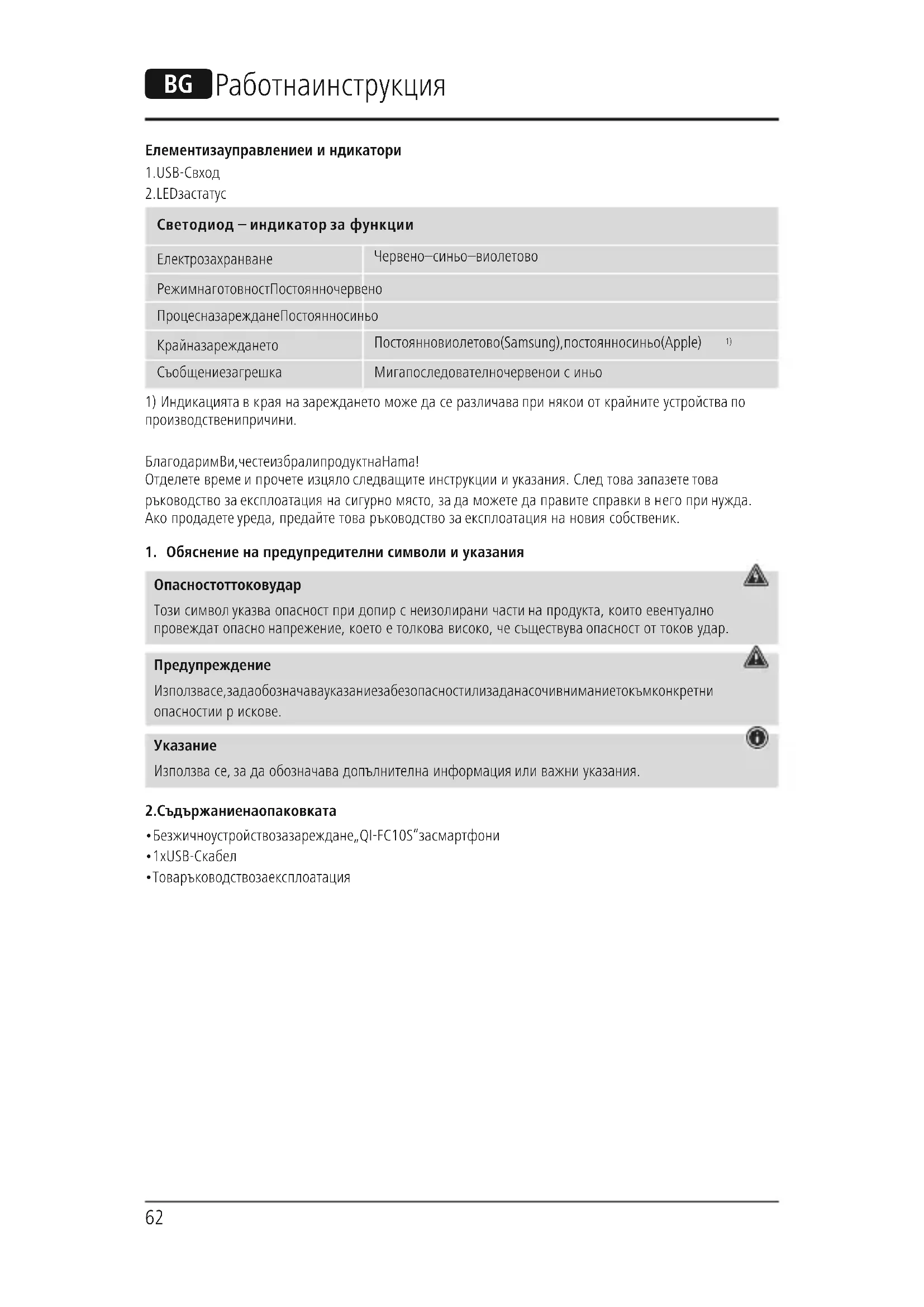 Светодиод – индикатор за функции Електрозахранване Червено – синьо – виолетово Режим на готовност Постоянно червено Процес на зареждане Постоянно синьо Край на зареждането Постоянно виолетово (Samsung), постоянно синьо (Apple)