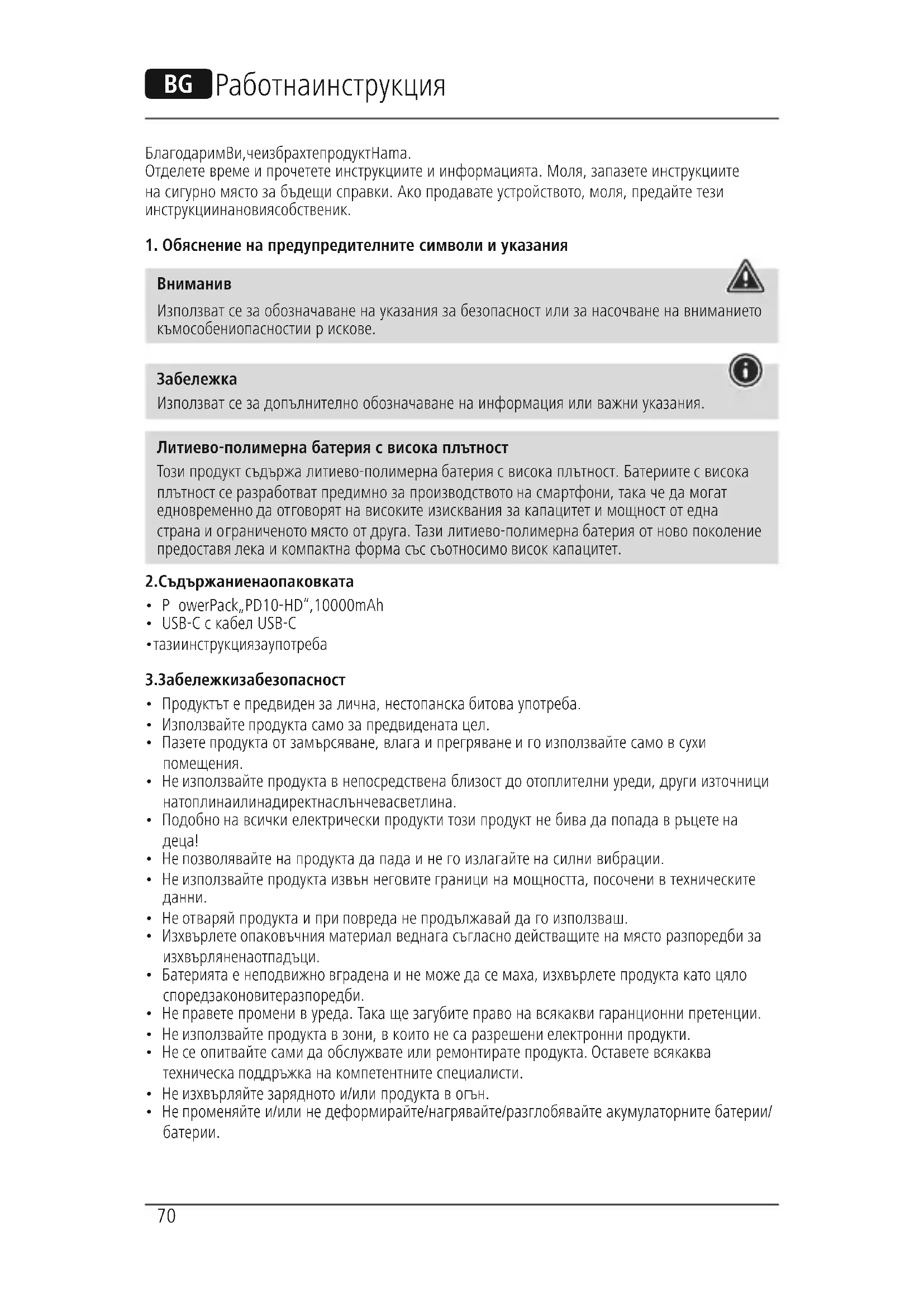 Използватсезадопълнително обозначаване на информация или важни указания. Литиево-полимерна батерия свисокаплътност Този продукт съдържа литиево-полимерна батерия свисока плътност. Батериите свисока плътност се разработватпредимно за производството на смартфони, така че да могат едновременно да отговорят на високите изисквания за капацитет имощност от една страна иограниченото мястоотдруга. Тази литиево-полимерна батерия от ново поколение предоставя лека икомпактна форма със съотносимо висок капацитет.
