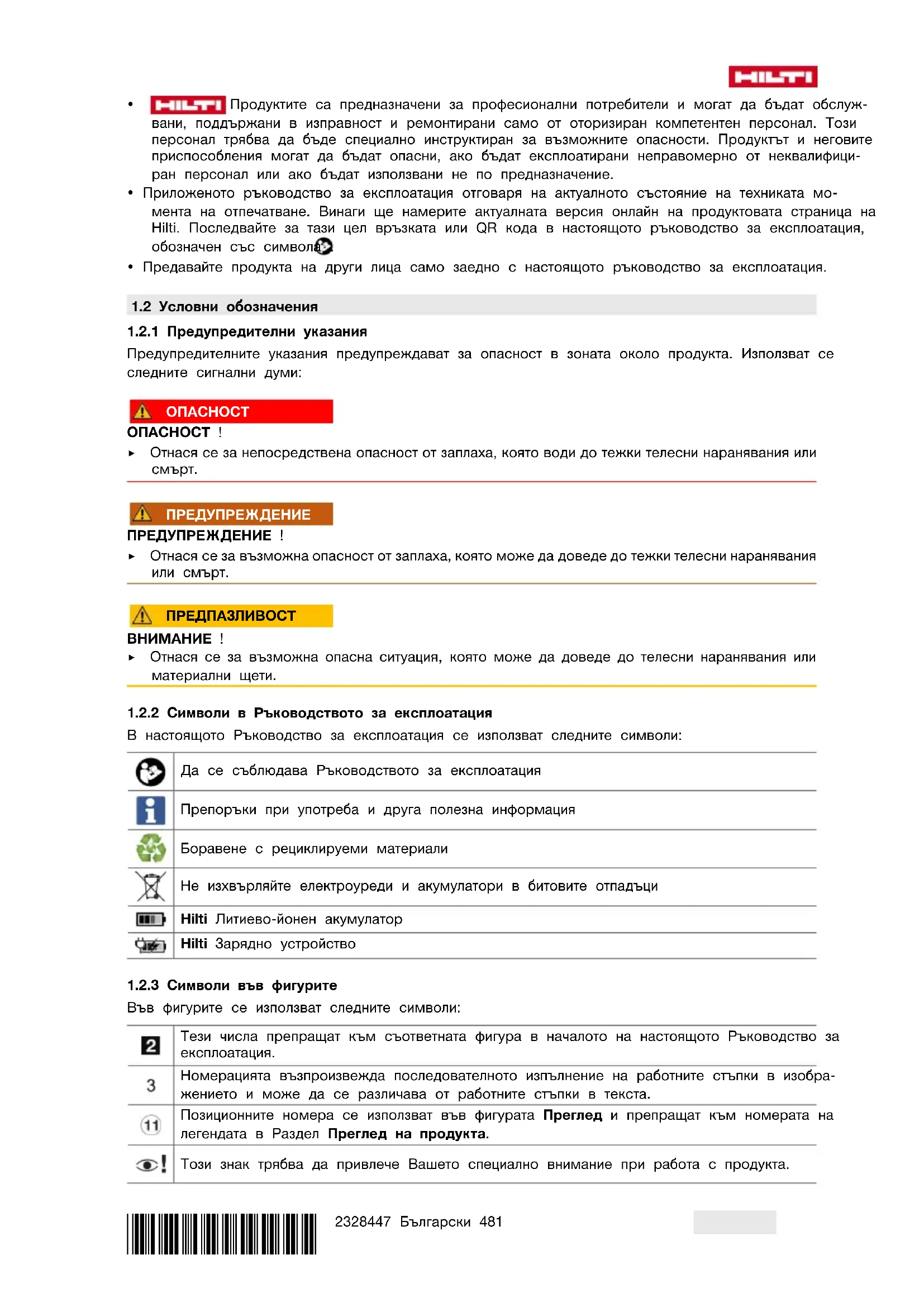 В настоящото Ръководство за експлоатация се използват следните символи: Да се съблюдава Ръководството за експлоатация Препоръки при употреба и друга полезна информация Боравене с рециклируеми материали Не изхвърляйте електроуреди и акумулатори в битовите отпадъци Hilti Литиево-йонен акумулатор Hilti Зарядно устройство