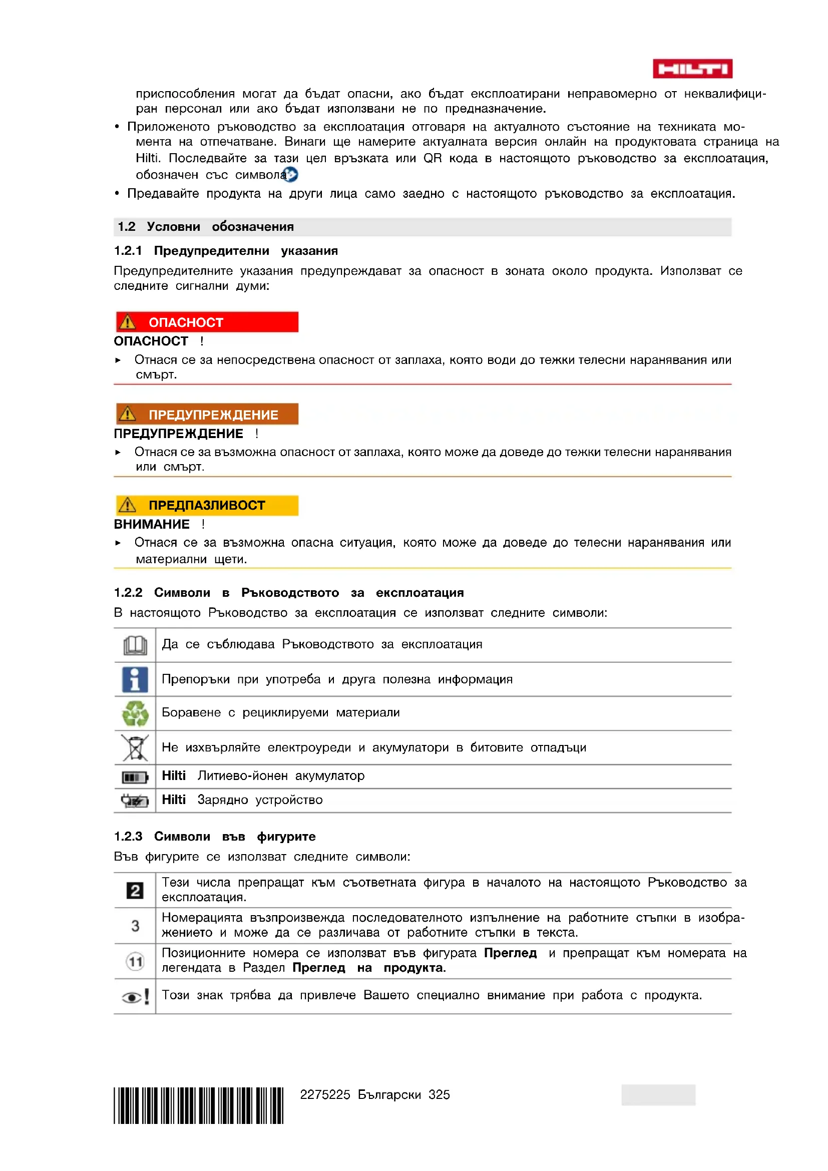 В настоящото Ръководство за експлоатация се използват следните символи: Да се съблюдава Ръководството за експлоатация Препоръки при употреба и друга полезна информация Боравене с рециклируеми материали Не изхвърляйте електроуреди и акумулатори в битовите отпадъци Hilti Литиево-йонен акумулатор Hilti Зарядно устройство