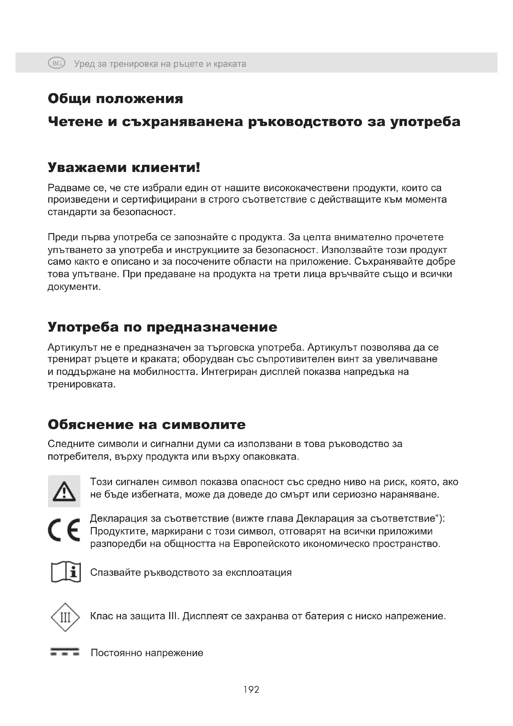 Употреба по предназначение Артикулът не е предназначен за търговска употреба. Артикулът позволява да се тренират ръцете и краката; оборудван със съпротивителен винт за увеличаване и поддържане на мобилността. Интегриран дисплей показва напредъка на тренировката. Обяснение на символите Следните символи и сигнални думи са използвани в това ръководство за потребителя, върху продукта или върху опаковката. Този сигнален символ показва опасност със средно ниво на риск, която, ако не бъде избегната, може да доведе до смърт или сериозно нараняване. Декларация за съответствие (вижте глава Декларация за съответствие“): Продуктите, маркирани с този символ, отговарят на всички приложими разпоредби на общността на Европейското икономическо пространство. Спазвайте ръкводството за експлоатация Клас на защита III. Дисплеят се захранва от батерия с ниско напрежение. Постоянно напрежениеBG Уред за тренировка на ръцете и краката Уред за тренировка на ръцете и краката