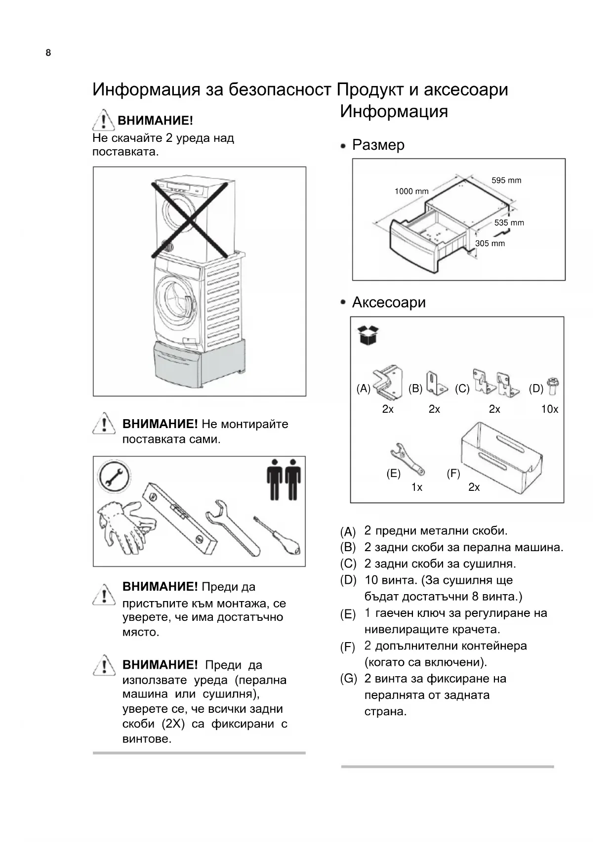 ВНИМАНИЕ! Преди да пристъпите към монтажа, се уверете, че има достатъчно място. ВНИМАНИЕ! Преди да използвате уреда (перална машина или сушилня), уверете се, че всички задни скоби (2X) са фиксирани с винтове.