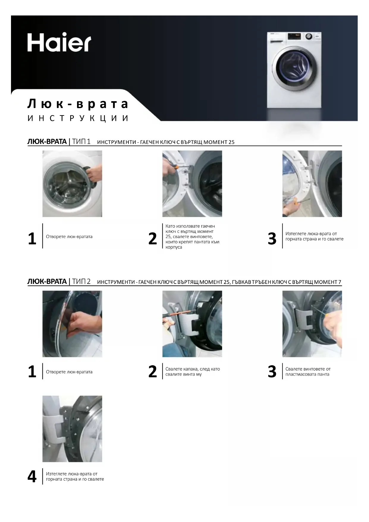 Препоръчваме Ви да следвате инструкциите по-горе. В случай на колебание, потърсете съвет от професионалист. Фирма Haier Europe отхвърля всяка отговорност за увреждания, които може да възникват вследствие на неспазване на предоставените инструкции.DVEŘE | TYP 1 NÁSTROJE - KLÍČ TORX 25