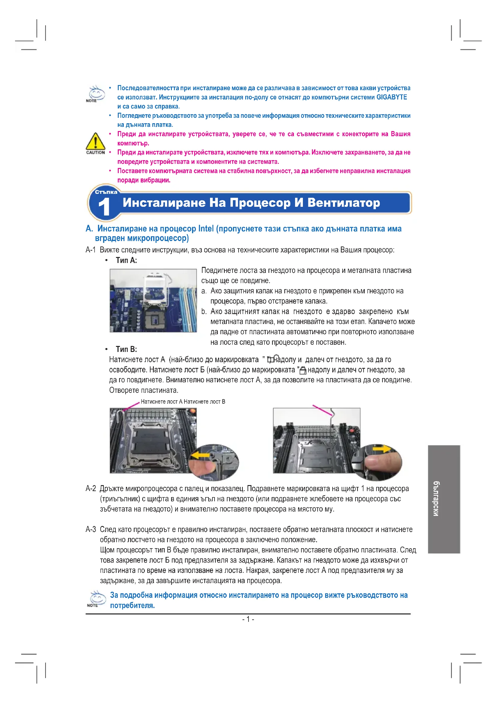 Повдигнете лоста за гнездото на процесора и металната пластина също ще се повдигне. a. Ако защитния капак на гнездото е прикрепен към гнездото на процесора, първо отстранете капака. b. Ако защитният капак на гнездото е здарво закрепено към металната пластина, не останявайте на този етап. Капачето може да падне от пластината автоматично при повторното използване на лоста след като процесорът е поставен. За подробна информация относно инсталирането на процесор вижте ръководството на потребителя. Натиснете лост A Натиснете лост B A-2 Дръжте микропроцесора с палец и показалец. Подравнете маркировката на щифт 1 на процесора (триъгълник) с щифта в единия ъгъл на гнездото (или подравнете жлебовете на процесора със зъбчетата на гнездото) и внимателно поставете процесора на мястото му. A-3 След като процесорът е правилно инсталиран, поставете обратно металната плоскост и натиснете обратно лостчето на гнездото на процесора в заключено положение. Щом процесорът тип B бъде правилно инсталиран, внимателно поставете обратно пластината. След това закрепете лост Б под предпазителя за задържане. Капакът на гнездото може да изхвърчи от пластината по време на използване на лоста. Накрая, закрепете лост А под предпазителя му за задържане, за да завършите инсталацията на процесора.- 2 -