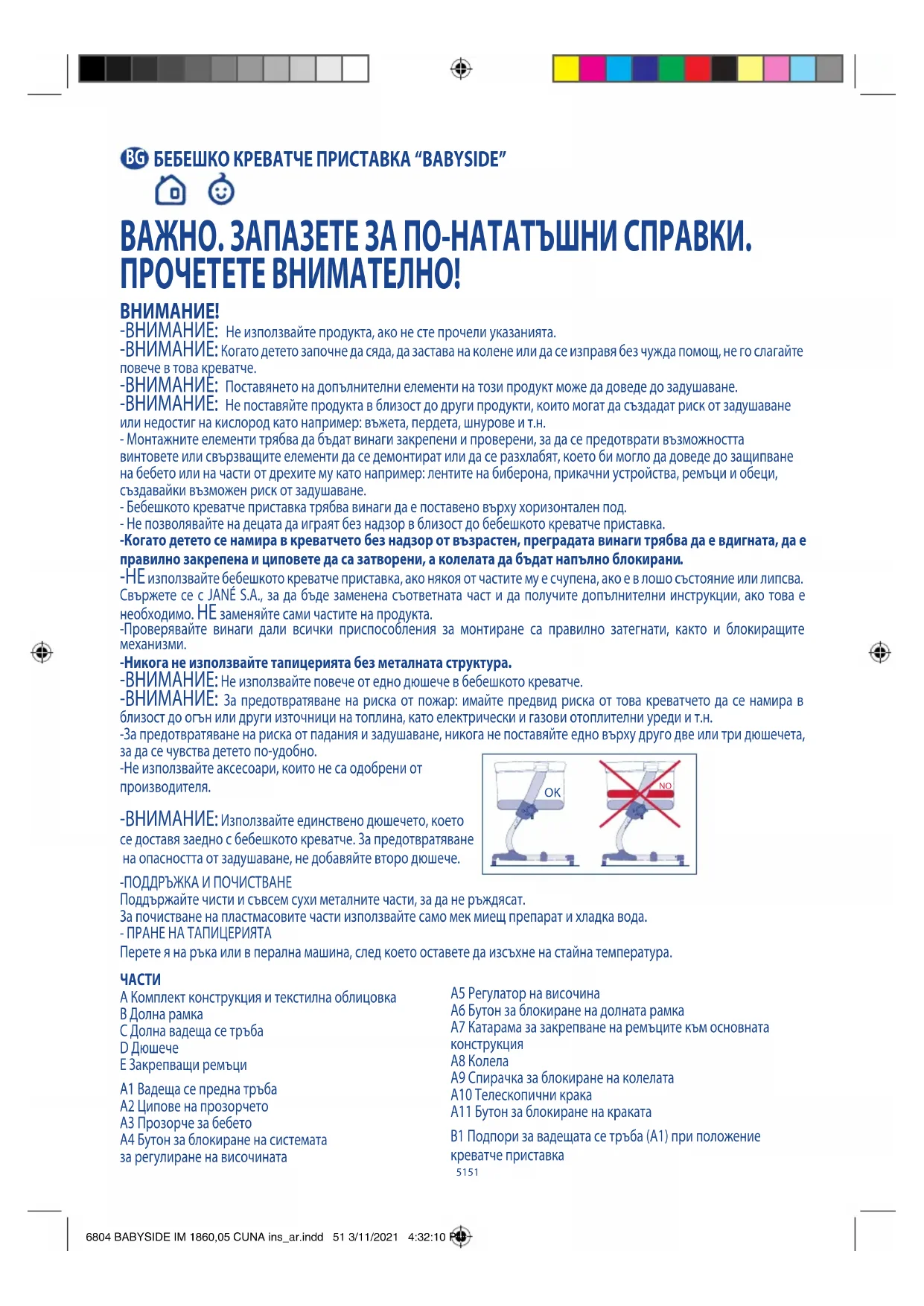 6804 BABYSIDE IM 1860,05 CUNA ins_ar.indd 58 3/11/2021 4:32:12 PMГАРАНЦИОННА ИНФОРМАЦИЯ - Този артикул има гаранция срещу производствени дефекти, така както е предвидено в действащите директиви и/или нормативни разпоредби относно гаранциите за потребителски стоки, приложими за Европейския съюз и специфични за държавата, в която артикулите се продават. - Трябва задължително да се представи фактура или касова бележка, за да е валидна гаранцията пред продавача на артикула или пред производителя. - Гаранцията изключва аномалии или повреди, причинени от неправилна употреба, от неспазване на предписанията за безопасност и на инструкциите за правилна употреба и поддръжка, или от износване в резултат на нормалната периодична употреба на артикула. - Етикетът, съдържащ серийния номер на вашия модел, в никакъв случай не трябва да се откъсва, тъй като съдържа важна информация за гаранцията.5959