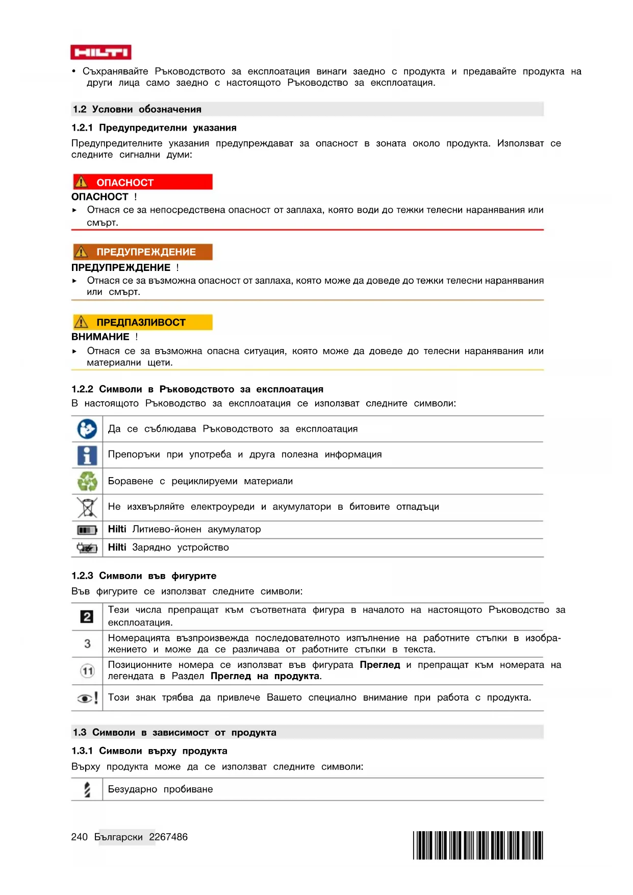 Производителят декларира на собствена отговорност, че описаният тук продукт отговаря на приложи- мото законодателство и действащите стандарти. Копие на Декларацията за съответствие ще намерите в края на настоящата документация. Техническата документация се съхранява тук: Hilti Entwicklungsgesellschaft mbH | Zulassung Geräte | Hiltistraße 6 | 86916 Kaufering, DE242 Български 2267486 *2267486* 2 Безопасност
