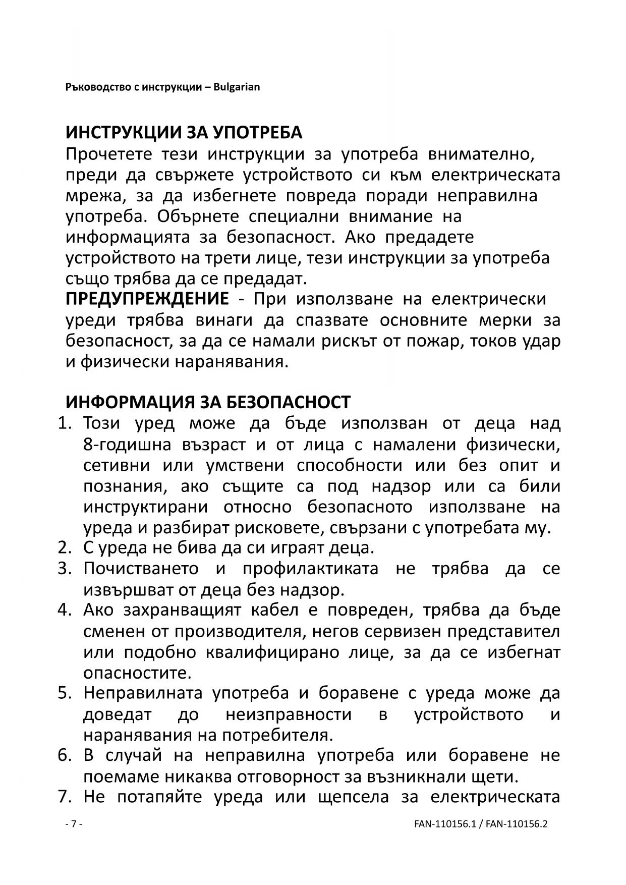 7. Не потапяйте уреда или щепсела за електрическата- 8 - FAN-110156.1 / FAN-110156.2