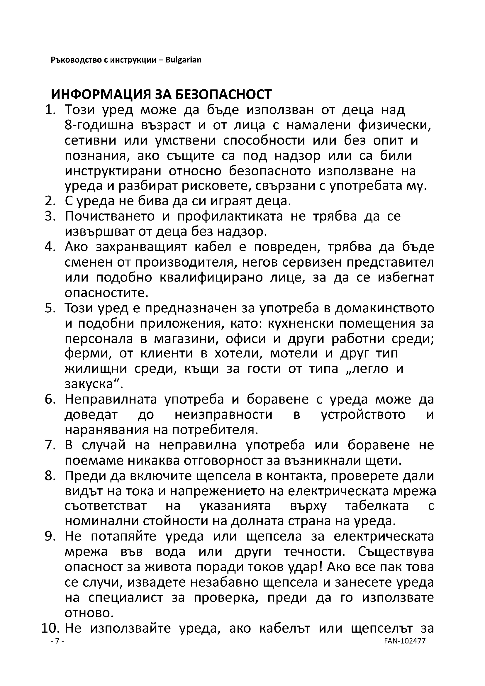 10. Не използвайте уреда, ако кабелът или щепселът за- 8 - FAN-102477