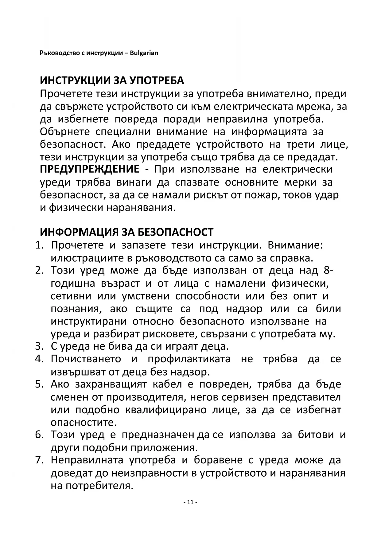 Regarding information for consumers on how to install, use and maintain the product, WEEE information, please check the instruction manual provided with packaging.- 11 - Ръководство с инструкции – Bulgarian ИНСТРУКЦИИ ЗА УПОТРЕБА Прочетете тези инструкции за употреба внимателно, преди да свържете устройството си към електрическата мрежа, за да избегнете повреда поради неправилна употреба. Обърнете специални внимание на информацията за безопасност. Ако предадете устройството на трети лице, тези инструкции за употреба също трябва да се предадат. ПРЕДУПРЕЖДЕНИЕ - При използване на електрически уреди трябва винаги да спазвате основните мерки за безопасност, за да се намали рискът от пожар, токов удар и физически наранявания. ИНФОРМАЦИЯ ЗА БЕЗОПАСНОСТ