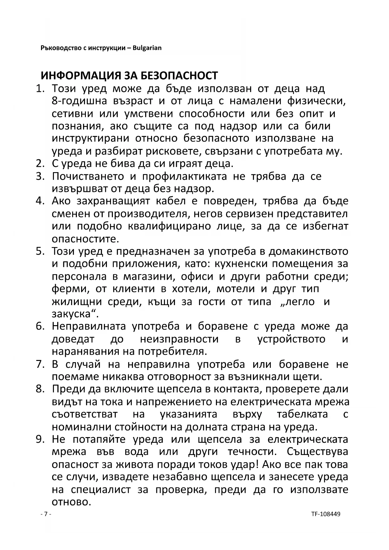 мрежа във вода или други течности. Съществува опасност за живота поради токов удар! Ако все пак това се случи, извадете незабавно щепсела и занесете уреда на специалист за проверка, преди да го използвате отново.- 8 - TF-108449