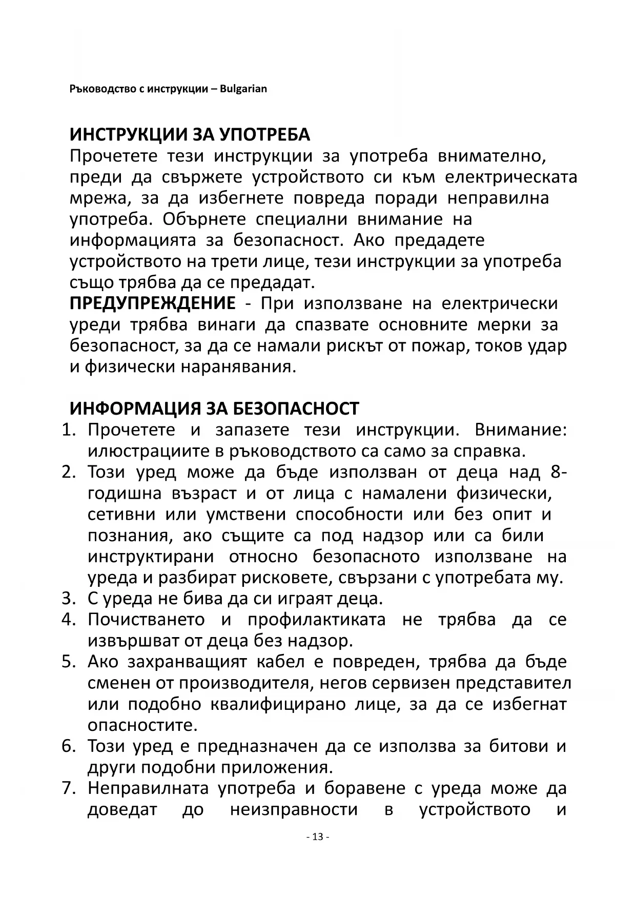 Regarding information for consumers on how to install, use and maintain the product, WEEE information, please check the instruction manual provided with packaging.- 13 - Ръководство с инструкции – Bulgarian ИНСТРУКЦИИ ЗА УПОТРЕБА Прочетете тези инструкции за употреба внимателно, преди да свържете устройството си към електрическата мрежа, за да избегнете повреда поради неправилна употреба. Обърнете специални внимание на информацията за безопасност. Ако предадете устройството на трети лице, тези инструкции за употреба също трябва да се предадат. ПРЕДУПРЕЖДЕНИЕ - При използване на електрически уреди трябва винаги да спазвате основните мерки за безопасност, за да се намали рискът от пожар, токов удар и физически наранявания. ИНФОРМАЦИЯ ЗА БЕЗОПАСНОСТ