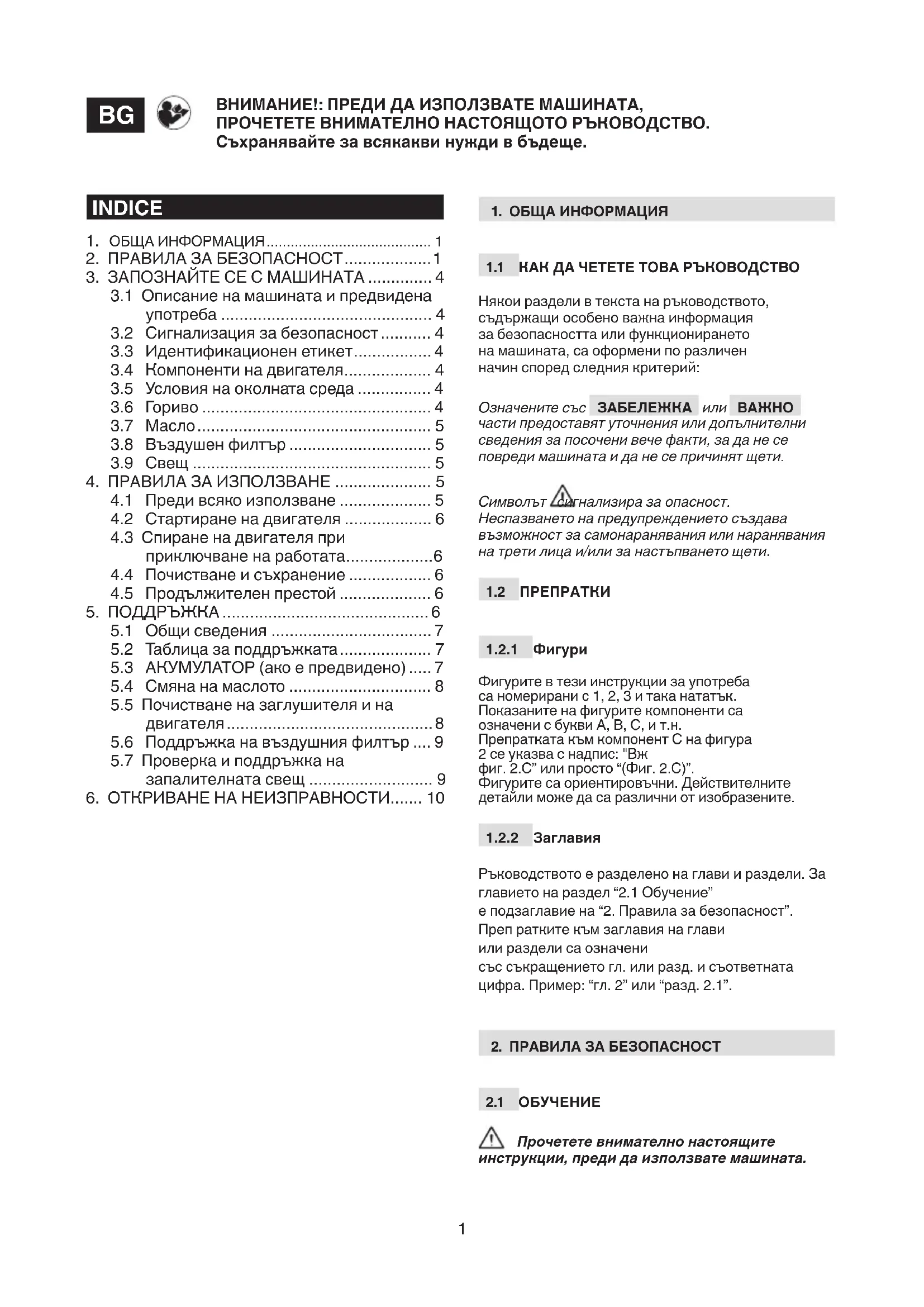 ПРЕДВИДЕНА УПОТРЕБА Тази машина представлява двигател с вътрешно горене. Двигателят е оборудване, чиито работни характеристики, регулярно функциониране и дълготрайност са обусловени от много фактори, някои от които са външни, а други - тясно свързани с качеството на вложените продукти и с редовната поддръжка. По-долу са посочени някои допълнителни сведения, които позволяват по-съзнателно използване на Вашата машина. Всяка друга употреба, различна от гореспоменатите, може да се окаже опасна и да причини щети на хора и/или вещи. ВАЖНО Несвойствената употреба на машината поражда отпадане на гаранцията и непоемане на каквато и да е отговорност от страна на Производителя, като прехвърля върху потребителя разходите, произтичащи от щети или наранявания - собствени или на трети лица.
