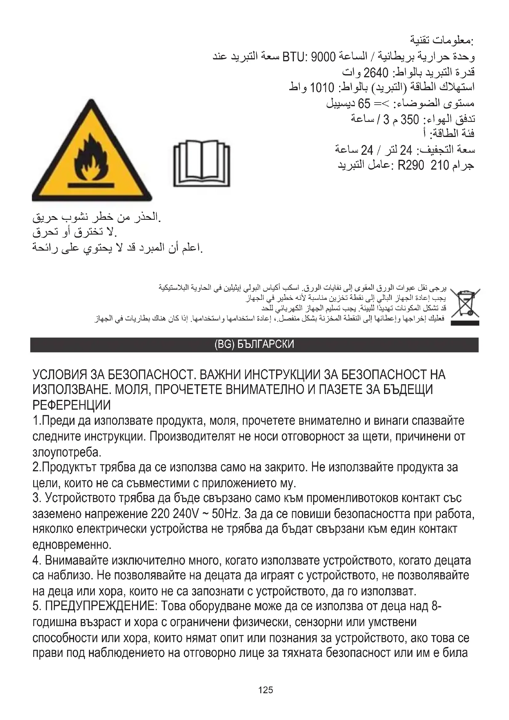заземенo напрежение 220 240V ~ 50Hz. За да се повиши безопасността при работа, няколко електрически устройства не трябва да бъдат свързани към един контакт едновременно. 2.Продуктът трябва да се използва само на закрито. Не използвайте продукта за цели, които не са съвместими с приложението му. (BG) БЪЛГАРСКИ126