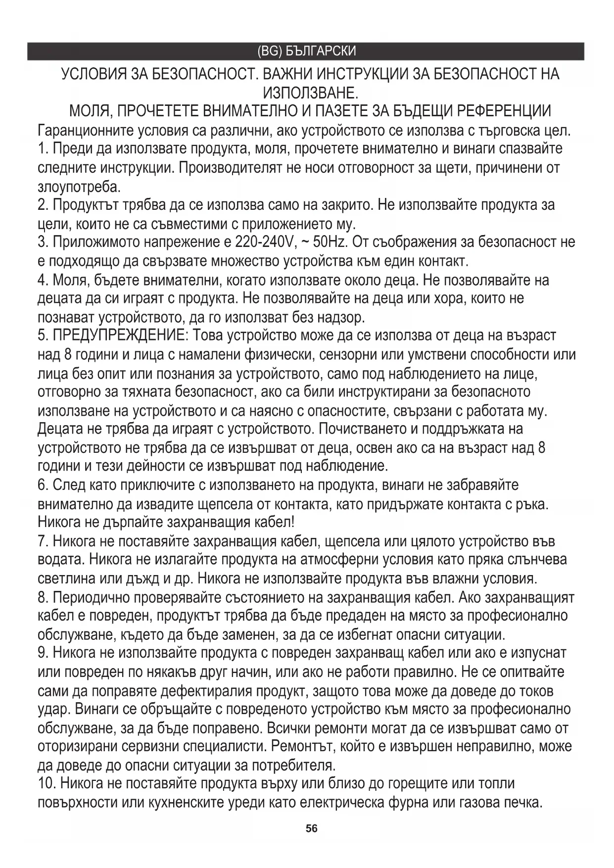 над 8 години и лица с намалени физически, сензорни или умствени способности или лица без опит или познания за устройството, само под наблюдението на лице, отговорно за тяхната безопасност, ако са били инструктирани за безопасното използване на устройството и са наясно с опасностите, свързани с работата му. Децата не трябва да играят с устройството. Почистването и поддръжката на устройството не трябва да се извършват от деца, освен ако са на възраст над 8 години и тези дейности се извършват под наблюдение.