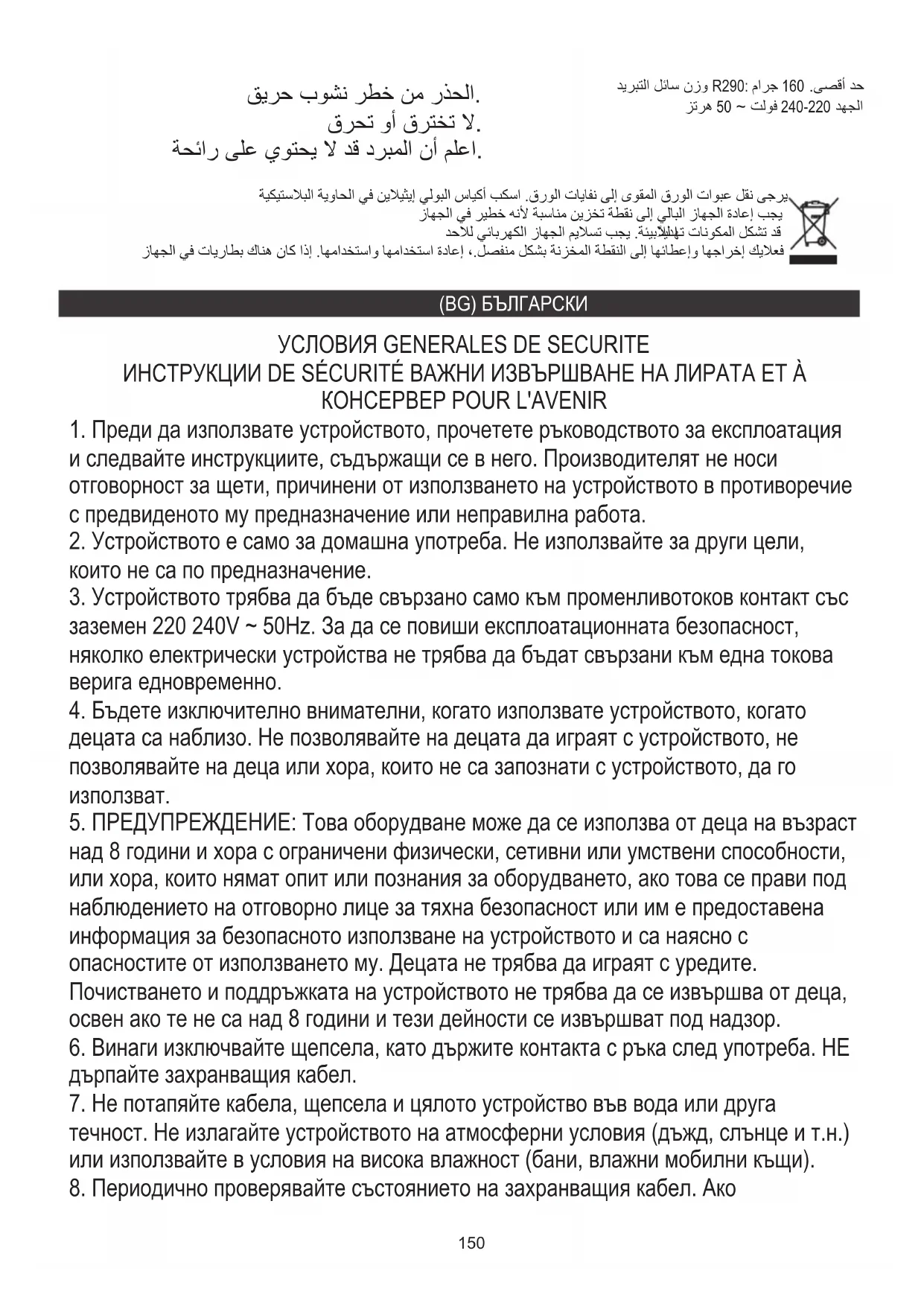 ﻖﯾرﺣ بوﺷﻧ رطﺧ نﻣ رذﺣﻟا. قرﺣﺗ وأ قرﺗﺧﺗ ﻻ. ﺔﺣﺋار ﻰﻠﻋ يوﺗﺣﯾ ﻻ دﻗ درﺑﻣﻟا نأ مﻠﻋا.151 захранващият кабел е повреден, той трябва да бъде сменен от специализиран сервиз, за да се избегне опасност.