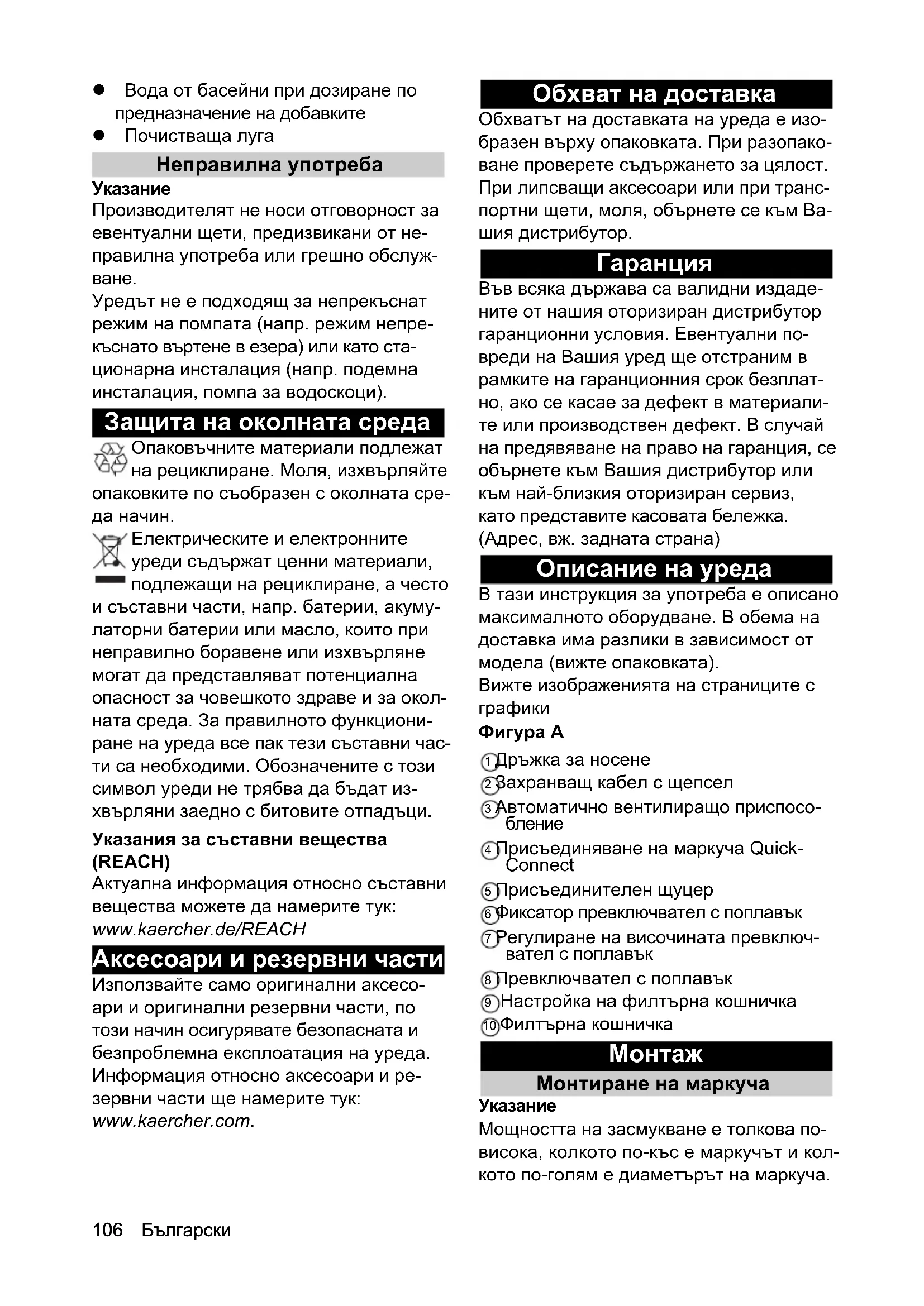 Електрическите и електронните уреди съдържат ценни материали, подлежащи на рециклиране, а често и съставни части, напр. батерии, акуму- латорни батерии или масло, които при неправилно боравене или изхвърляне могат да представляват потенциална опасност за човешкото здраве и за окол- ната среда. За правилното функциони- ране на уреда все пак тези съставни час- ти са необходими. Обозначените с този символ уреди не трябва да бъдат из- хвърляни заедно с битовите отпадъци. Указания за съставни вещества (REACH) Актуална информация относно съставни вещества можете да намерите тук: www.kaercher.de/REACH Аксесоари и резервни части Използвайте само оригинални аксесо- ари и оригинални резервни части, по този начин осигурявате безопасната и безпроблемна експлоатация на уреда. Информация относно аксесоари и ре- зервни части ще намерите тук: www.kaercher.com. Обхват на доставка Обхватът на доставката на уреда е изо- бразен върху опаковката. При разопако- ване проверете съдържането за цялост. При липсващи аксесоари или при транс- портни щети, моля, обърнете се към Ва- шия дистрибутор.