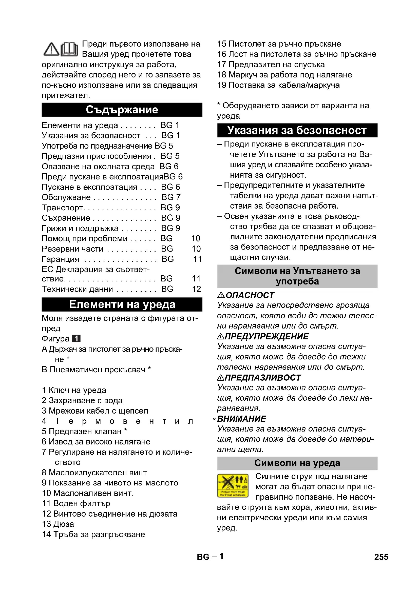 Символи на уреда 255BG– 2 Съгласно валидните разпоред- би не се позволява използване на уреда в мрежата за питейна вода без разделител на систе- мата. Използвайте подходящ раздели- тел на системата на фирма Kärcher или като алтернатива разделител на систе- мата съгл. EN 12729, тип BA. Преминалата през разделителя на сис- темата вода се определя като негодна