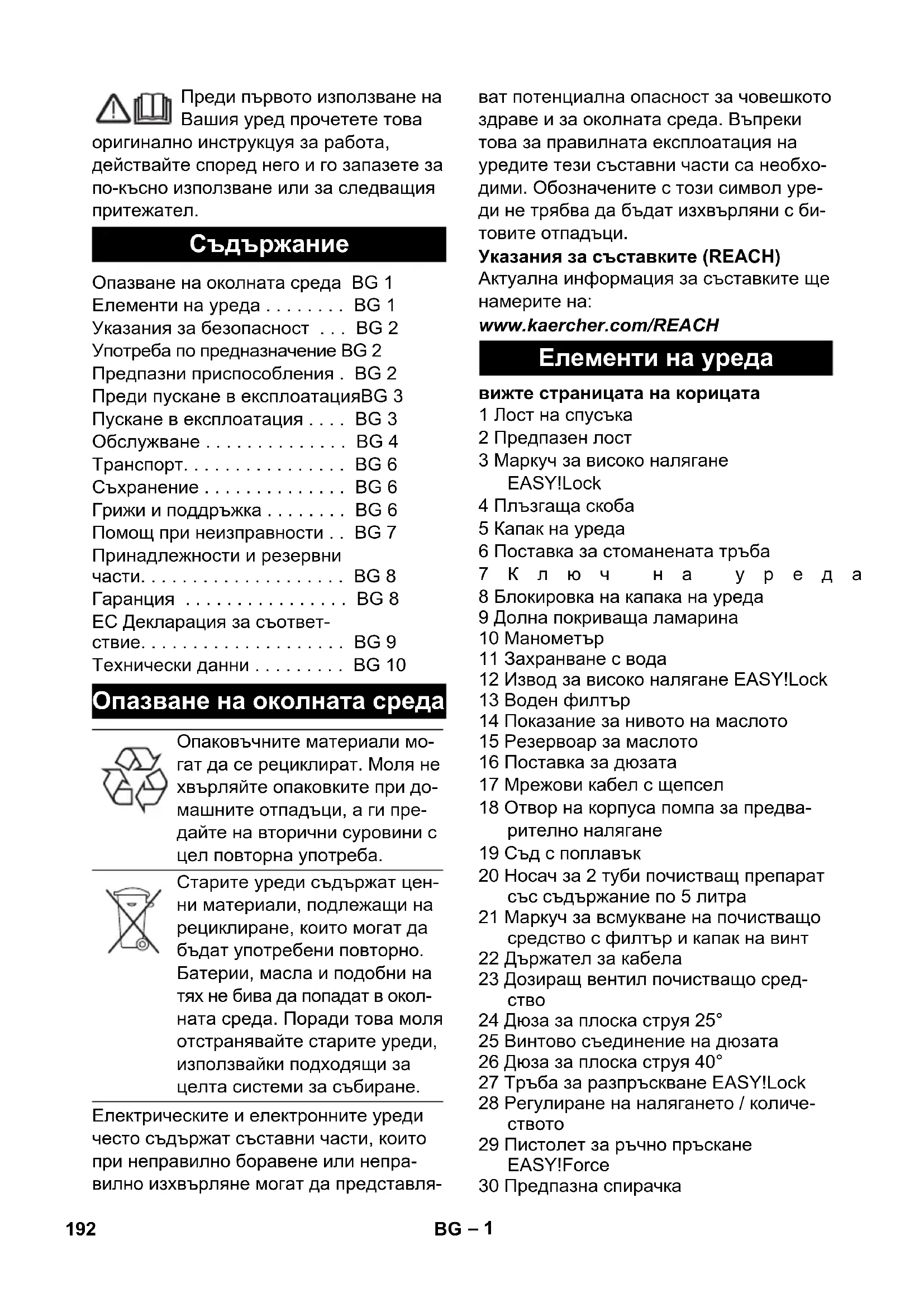 Опазване на околната среда BG 1 Елементи на уреда . . . . . . . . BG 1 Указания за безопасност . . . BG 2 Употреба по предназначение BG 2 Предпазни приспособления . BG 2 Преди пускане в експлоатацияBG 3 Пускане в експлоатация . . . . BG 3 Обслужване . . . . . . . . . . . . . . BG 4 Tранспoрт. . . . . . . . . . . . . . . . BG 6 Съхранение . . . . . . . . . . . . . . BG 6 Грижи и поддръжка . . . . . . . . BG 6 Помощ при неизправности . . BG 7 Принадлежности и резервни части. . . . . . . . . . . . . . . . . . . . BG 8 Гаранция . . . . . . . . . . . . . . . . BG 8 EC Декларация за съответ- ствие. . . . . . . . . . . . . . . . . . . . BG 9 Технически данни . . . . . . . . . BG 10 Опазване на околната среда Опаковъчните материали мо- гат да се рециклират. Моля не хвърляйте опаковките при до- машните отпадъци, а ги пре- дайте на вторични суровини с цел повторна употреба. Старите уреди съдържат цен- ни материали, подлежащи на рециклиране, които могат да бъдат употребени повторно. Батерии, масла и подобни на тях не бива да попадат в окол- ната среда. Поради това моля отстранявайте старите уреди, използвайки подходящи за целта системи за събиране. Елементи на уреда 192 BG– 2 – Обслужващите елементи за процеса на обслужване са жълти. – Обслужващите елементи за под- дръжка и сервиз са светлосиви. – Преди първото пускане в експлоата- ция непременно прочетете Упътва- нето за експлоатация № 5.951-949.0! – Да се спазват съответните нацио- нални изисквания на законодателя за струйни апарати. – Да се спазват съответните нацио- нални изисквания на законодателя за предпазване от злополуки. Струй- ните апарати трябва да се проверя- ват редовно и резултата от провер- ката да се записва. – По уреда/аксесоарите не трябва да се предприемат промени.