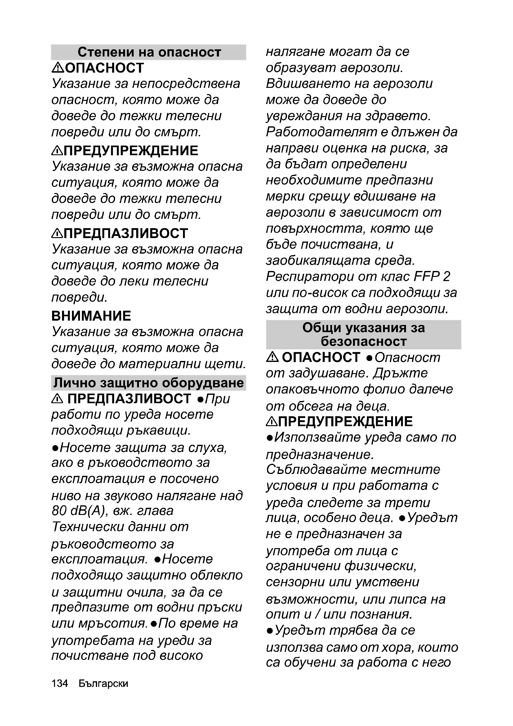 ситуация, която може да доведе до материални щети. Лично защитно оборудване 몇 ПРЕДПАЗЛИВОСТ ●При работи по уреда носете подходящи ръкавици. ●Носете защита за слуха, ако в ръководството за експлоатация е посочено ниво на звуково налягане над 80 dB(A), вж. глава Технически данни от ръководството за експлоатация. ●Носете подходящо защитно облекло и защитни очила, за да се предпазите от водни пръски или мръсотия. ●По време на употребата на уреди за почистване под високо налягане могат да се образуват аерозоли. Вдишването на аерозоли може да доведе до увреждания на здравето. Работодателят е длъжен да направи оценка на риска, за да бъдат определени необходимите предпазни мерки срещу вдишване на аерозоли в зависимост от повърхността, която ще бъде почиствана, и заобикалящата среда. Респиратори от клас FFP 2 или по-висок са подходящи за защита от водни аерозоли. Общи указания за безопасност ОПАСНОСТ ●Опасност от задушаване. Дръжте опаковъчното фолио далече от обсега на деца. 몇 ПРЕДУПРЕЖДЕНИЕ ●Използвайте уреда само по предназначение. Съблюдавайте местните условия и при работата с уреда следете за трети лица, особено деца. ●Уредът не е предназначен за употреба от