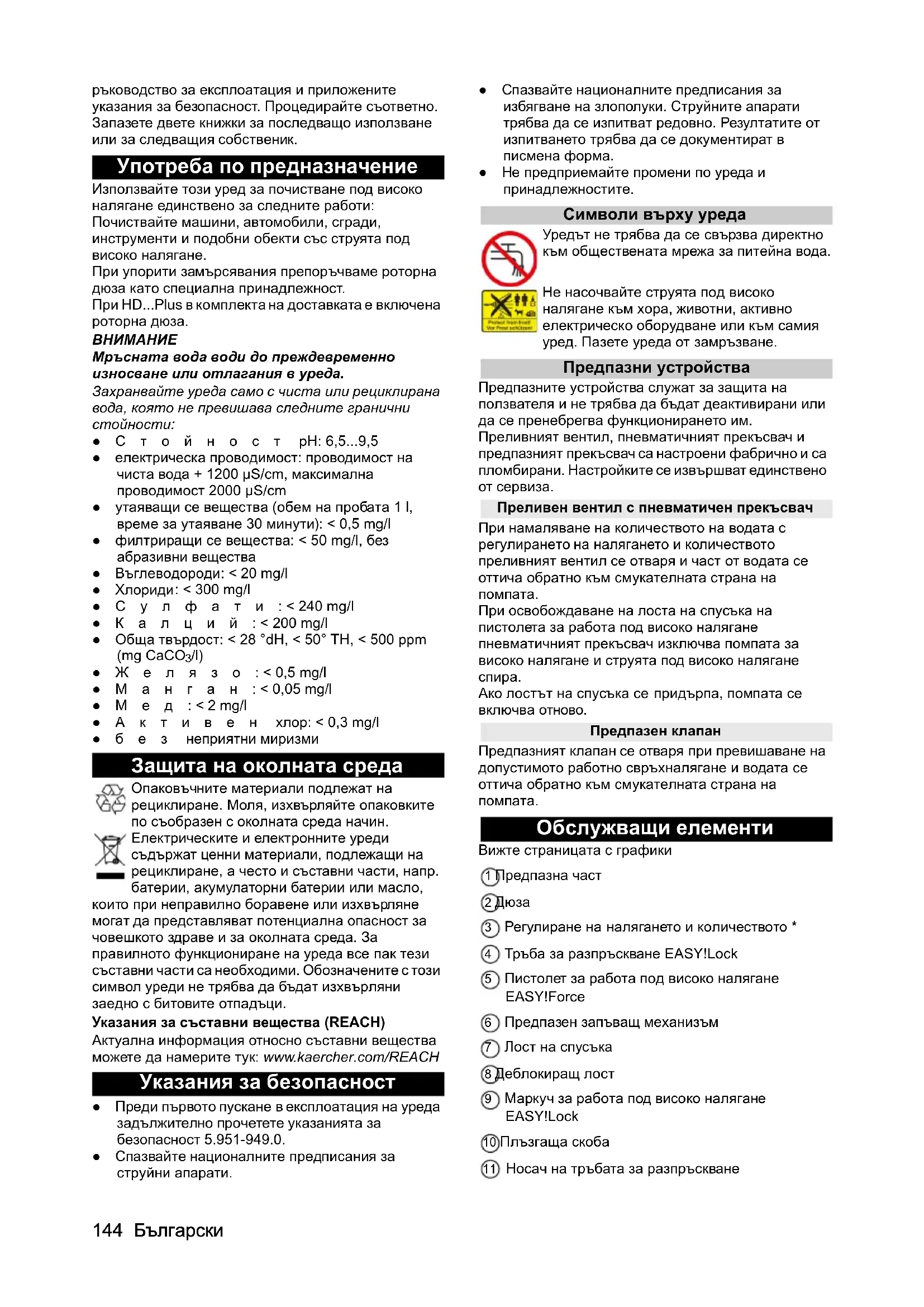 /l) ●Желязо: < 0,5 mg/l ●Манган: < 0,05 mg/l ●Мед: < 2 mg/l ●Активен хлор: < 0,3 mg/l ●без неприятни миризми Защита на околната среда Опаковъчните материали подлежат на рециклиране. Моля, изхвърляйте опаковките по съобразен с околната среда начин. Електрическите и електронните уреди съдържат ценни материали, подлежащи на рециклиране, а често и съставни части, напр. батерии, акумулаторни батерии или масло, които при неправилно боравене или изхвърляне могат да представляват потенциална опасност за човешкото здраве и за околната среда. За правилното функциониране на уреда все пак тези съставни части са необходими. Обозначените с този символ уреди не трябва да бъдат изхвърляни заедно с битовите отпадъци. Указания за съставни вещества (REACH) Актуална информация относно съставни вещества можете да намерите тук: www.kaercher.com/REACH Указания за безопасност ●Преди първото пускане в експлоатация на уреда задължително прочетете указанията за безопасност 5.951-949.0. ●Спазвайте националните предписания за струйни апарати. ●Спазвайте националните предписания за избягване на злополуки. Струйните апарати трябва да се изпитват редовно. Резултатите от изпитването трябва да се документират в писмена форма. ●Не предприемайте промени по уреда и принадлежностите. Символи върху уреда Уредът не трябва да се свързва директно към обществената мрежа за питейна вода. Не насочвайте струята под високо налягане към хора, животни, активно електрическо оборудване или към самия уред. Пазете уреда от замръзване. Предпазни устройства Предпазните устройства служат за защита на ползвателя и не трябва да бъдат деактивирани или да се пренебрегва функционирането им. Преливният вентил, пневматичният прекъсвач и предпазният прекъсвач са настроени фабрично и са пломбирани. Настройките се извършват единствено от сервиза. Преливен вентил с пневматичен прекъсвач При намаляване на количеството на водата с регулирането на налягането и количеството преливният вентил се отваря и част от водата се оттича обратно към смукателната страна на