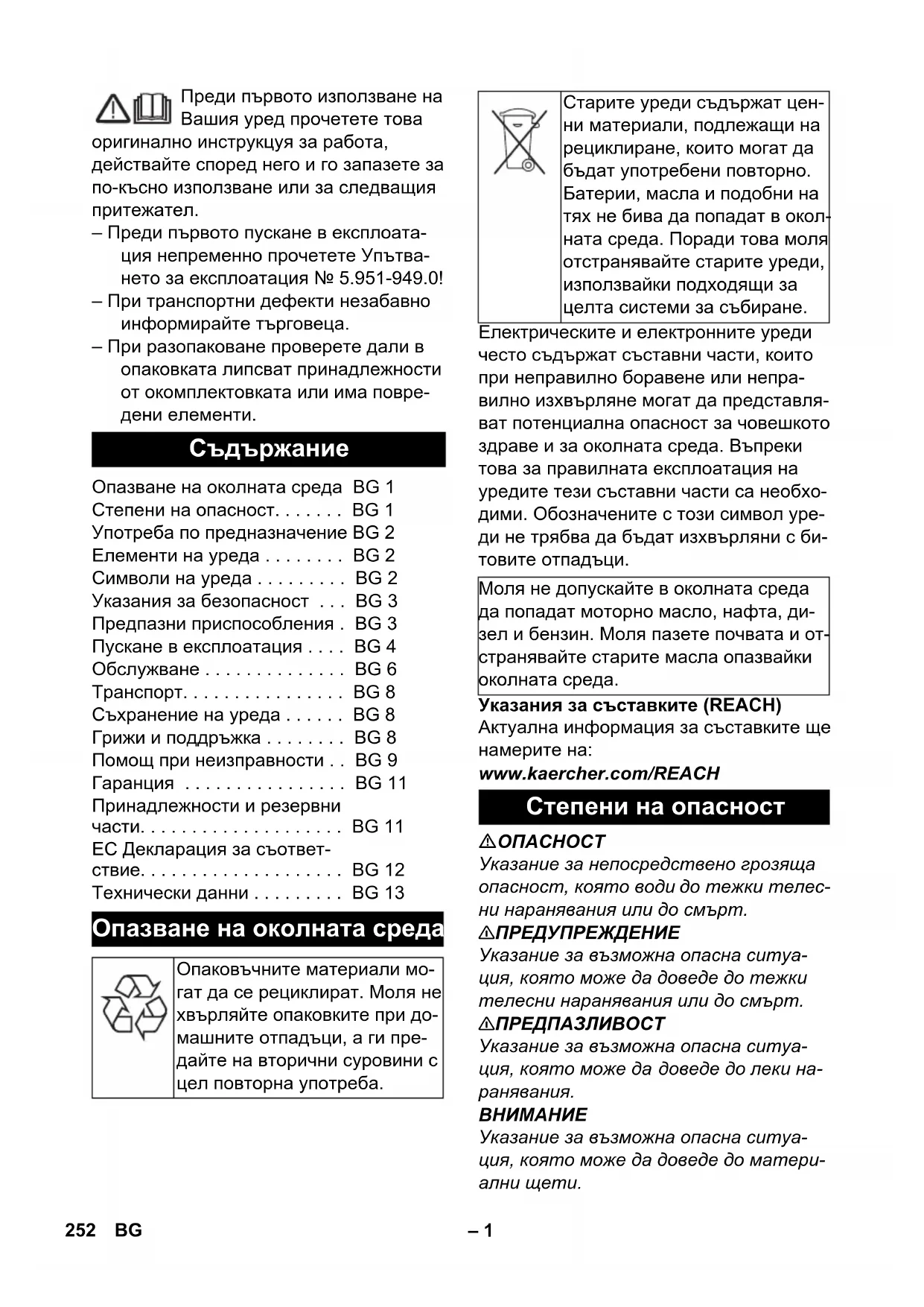 dB(A) 93 97 96 251SR– 1 Преди първото използване на Вашия уред прочетете това оригинално инструкцуя за работа, действайте според него и го запазете за по-късно използване или за следващия притежател. – Преди първото пускане в експлоата- ция непременно прочетете Упътва- нето за експлоатация № 5.951-949.0! – При транспортни дефекти незабавно информирайте търговеца. – При разопаковане проверете дали в опаковката липсват принадлежности от окомплектовката или има повре- дени елементи. Електрическите и електронните уреди често съдържат съставни части, които при неправилно боравене или непра- вилно изхвърляне могат да представля- ват потенциална опасност за човешкото здраве и за околната среда. Въпреки това за правилната експлоатация на уредите тези съставни части са необхо- дими. Обозначените с този символ уре- ди не трябва да бъдат изхвърляни с би- товите отпадъци. Указания за съставките (REACH) Актуална информация за съставките ще намерите на: www.kaercher.com/REACH