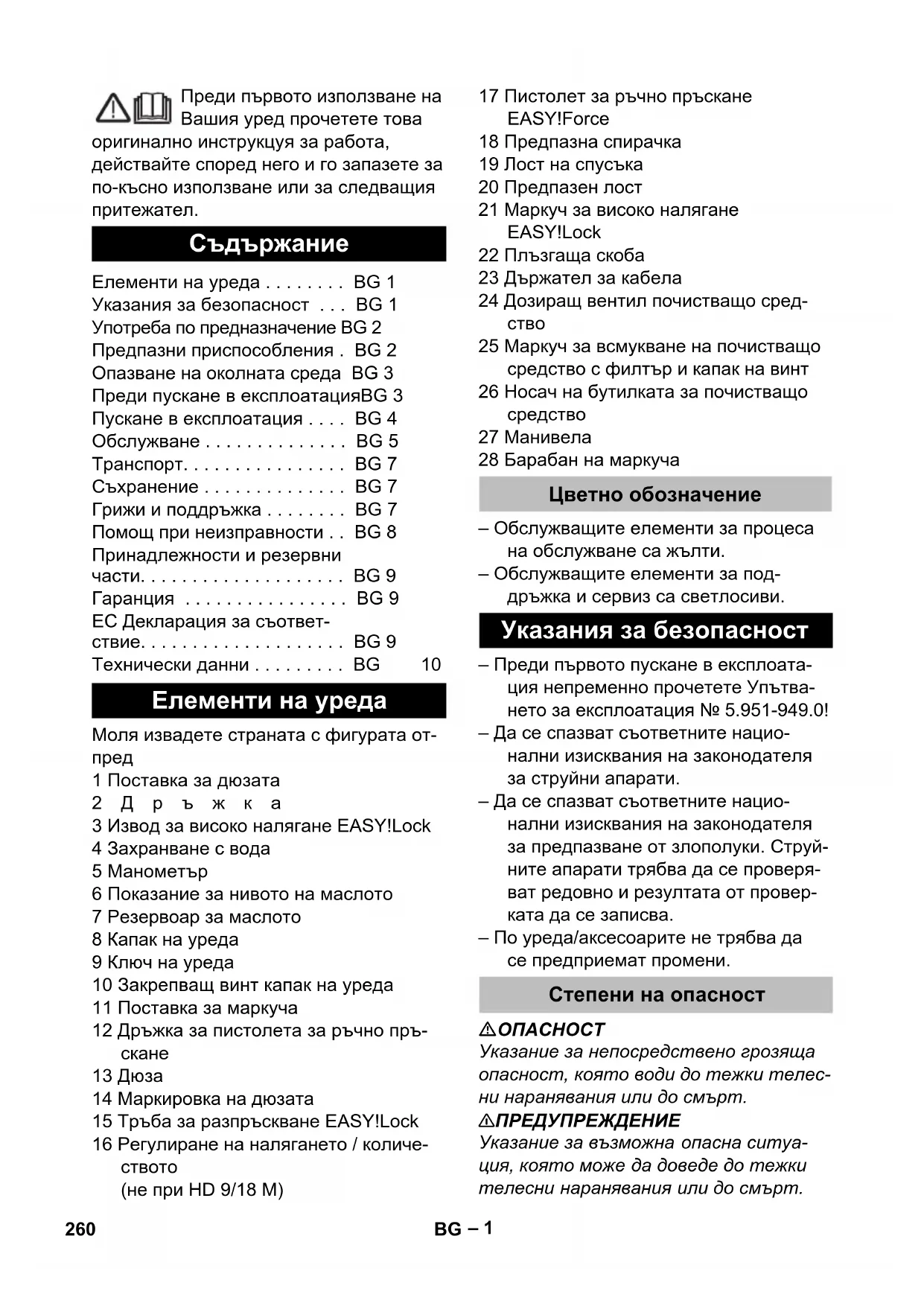261BG– 3 Ако лостът на спусъка на пистолета за ръчно пръскане се освободи, пневма- тичният контакт изключва помпата, стру- ята под високо налягане прекъсва. Ако лостът на спусъка се придърпа, помпата се включва отново. Предпазният клапан отваря при надви- шаване на допустимото работно свръх- налягане, водата изтича обратно към смукателната страна на помпата. Преливен вентил, пневматичен прекъс- вач и предпазен клапан са настроени фабрично и пломбирани. Настройка само в сервиза. Електрическите и електронните уреди често съдържат съставни части, които при неправилно боравене или непра- вилно изхвърляне могат да представля- ват потенциална опасност за човешкото здраве и за околната среда. Въпреки това за правилната експлоатация на уредите тези съставни части са необхо- дими. Обозначените с този символ уре- ди не трябва да бъдат изхвърляни с би- товите отпадъци. Указания за съставките (REACH) Актуална информация за съставките ще намерите на: www.kaercher.com/REACH – Съдържанието на опаковката да се провери при разопаковане. – При транспортни дефекти незабавно информирайте търговеца. Показанието за нивото на маслото да се отчете при уред в покой. Ниво- то на маслото трябва да бъде над двете стрелки. Да се развие закрепващия винт на капака на уреда, да се свали капака