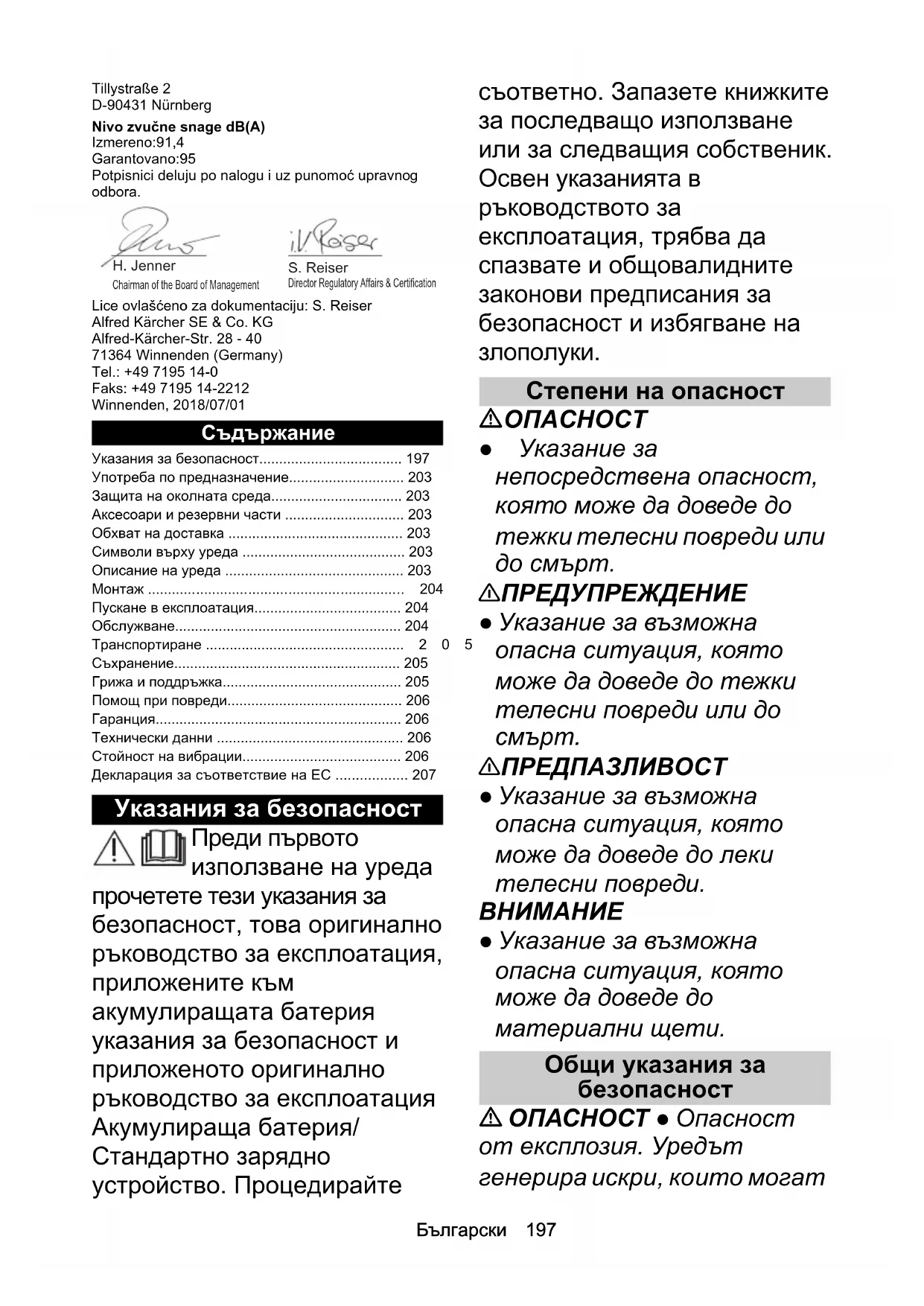 - Декларация за съответствие на ЕС Chairman of the Board of ManagementDirector Regulatory Affairs & Certification H. Jenner S. Reiser198 Български да възпламенят прах, газ или пари. Не работете с уреда в експлозивна среда, в която има запалими течности, газове или прахове. 몇 ПРЕДУПРЕЖДЕНИЕ ● Опасност от злополука. Поддържайте работното си място чисто и добре осветено. ● Дръжте децата и страничните хора далеч от зоната на работа, докато използвате уреда. ● Опасност от токов удар. Пазете уреда от дъжд и влага. ● Избягвайте неволно включване. Уверявайте се, че преди свързването на акумулиращата батерия, повдигането или носенето на уреда прекъсвачът Вкл./ Изкл. е в положение Изкл. ● Наранявания поради останал върху въртяща се част на инструмента ключ за настройка. Преди да включите уреда, отстранете ключовете за настройка. ● При работа с уреда не тичайте, а ходете. Не вървете назад. Избягвайте необичайна позиция на тялото, осигурете си устойчиво, стабилно положение и пазете равновесие. ● Никога не работете с уреда, ако прекъсвачът за вкл./изкл. на ръкохватката не включва и изключва правилно. ● Не претоварвайте уреда. ● Поддържайте режещите инструменти винаги остри и чисти. Острите режещи инструменти могат да се контролират по-лесно и не се блокират лесно. ● Изключете двигателя, извадете акумулиращата батерия и се уверете, че всички движещи се части са напълно спрени: Преди да предприемете p. 207