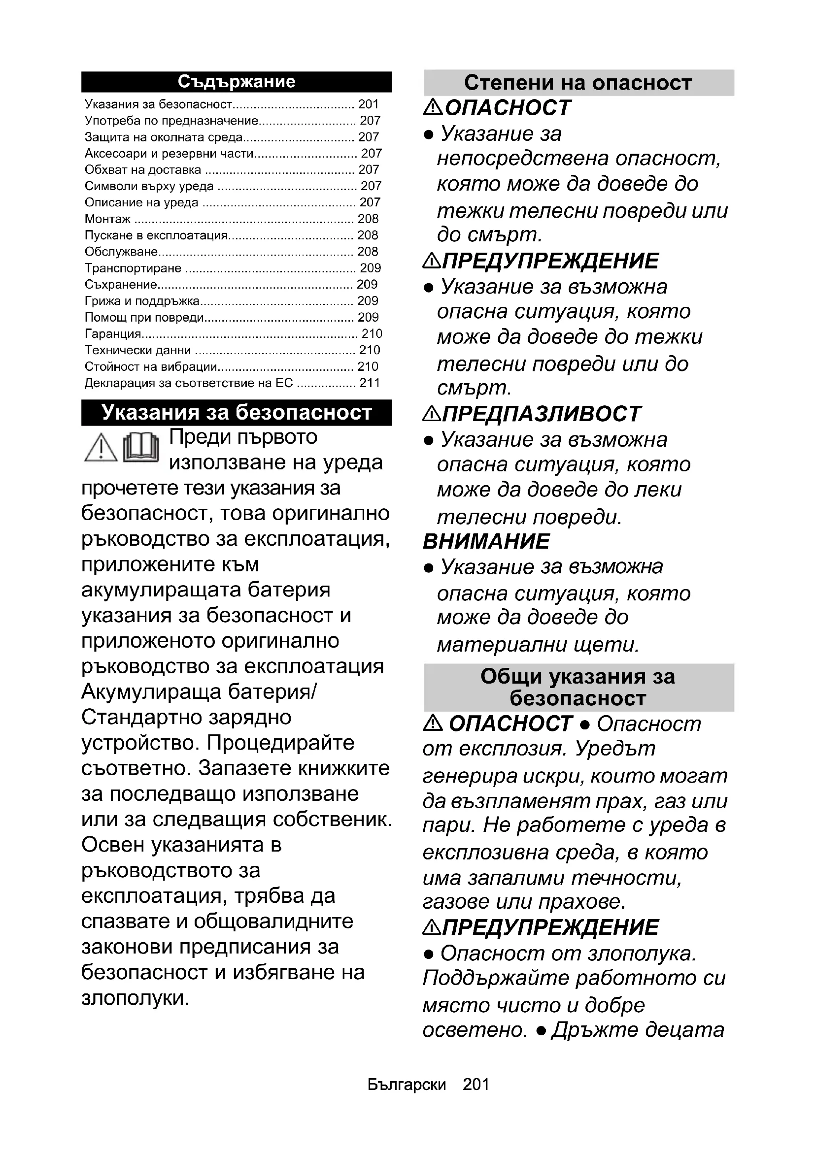 • Декларация за съответствие на ЕС 02 Български и страничните хора далеч от зоната на работа, докато използвате уреда. ● Опасност от токов удар. Пазете уреда от дъжд и влага. ● Избягвайте неволно включване. Уверявайте се, че преди свързването на акумулиращата батерия, повдигането или носенето на уреда прекъсвачът Вкл./ Изкл. е в положение Изкл. ● Наранявания поради останал върху p. 2112