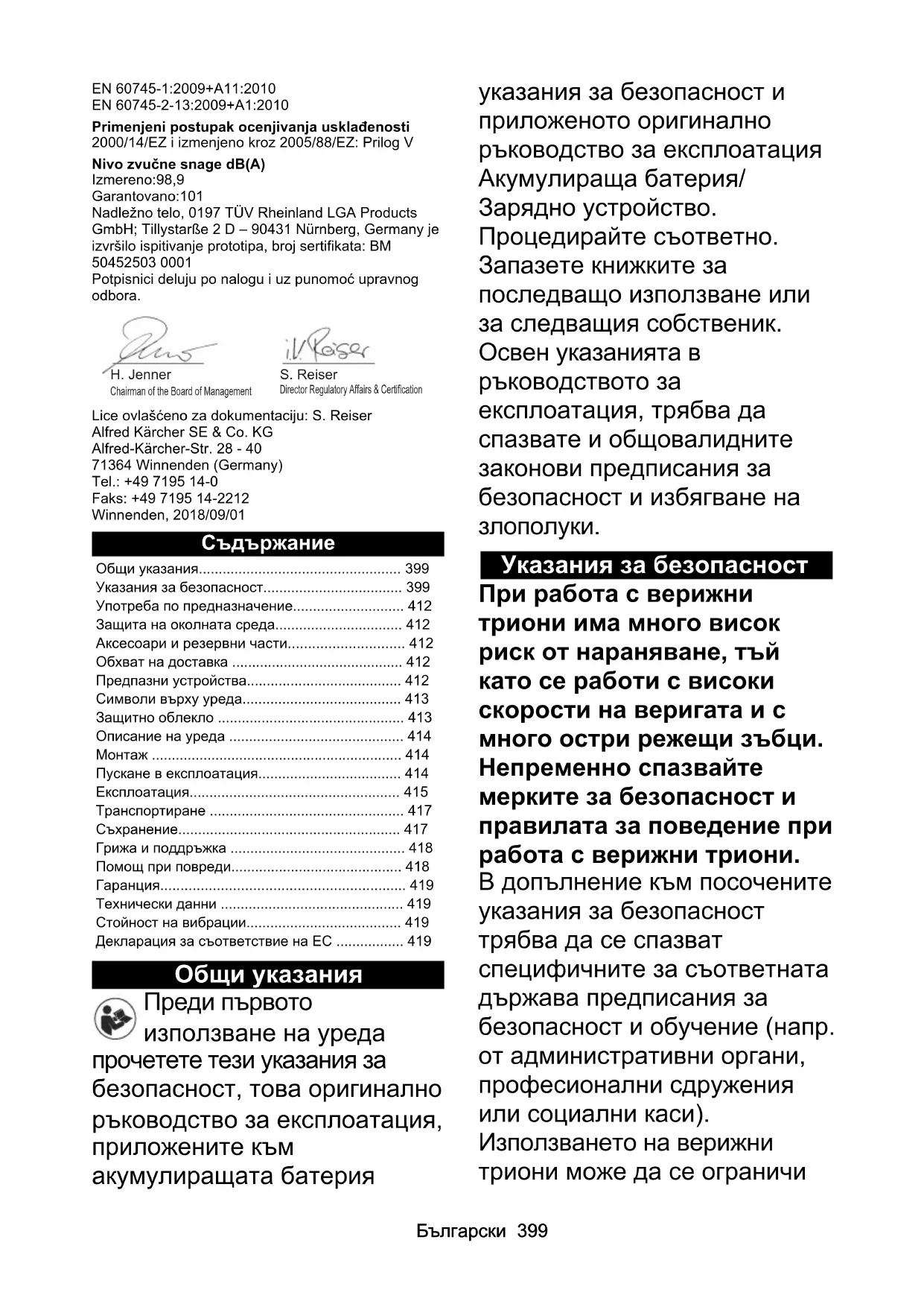 • Декларация за съответствие на ЕС Chairman of the Board of ManagementDirector Regulatory Affairs & Certification H. Jenner S. Reiser400 Български във времето поради локалните разпоредби (част от деня или сезон от годината). Спазвайте локалните предписания. Степени на опасност p. 419