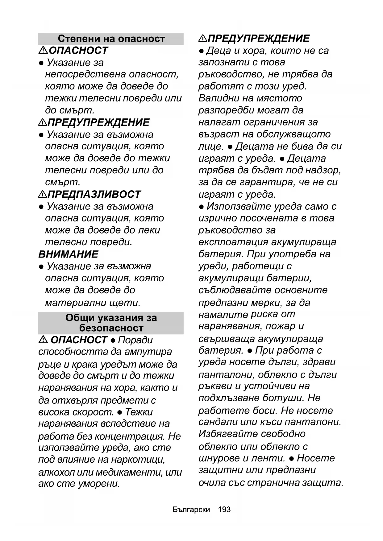 за възможна опасна ситуация, която може да доведе до материални щети. Общи указания за безопасност ОПАСНОСТ ● Поради способността да ампутира ръце и крака уредът може да доведе до смърт и до тежки наранявания на хора, както и да отхвърля предмети с висока скорост. ● Тежки наранявания вследствие на работа без концентрация. Не използвайте уреда, ако сте под влияние на наркотици, алкохол или медикаменти, или ако сте уморени. 몇 ПРЕДУПРЕЖДЕНИЕ ● Деца и хора, които не са запознати с това ръководство, не трябва да работят с този уред. Валидни на мястото разпоредби могат да налагат ограничения за възраст на обслужващото лице. ● Децата не бива