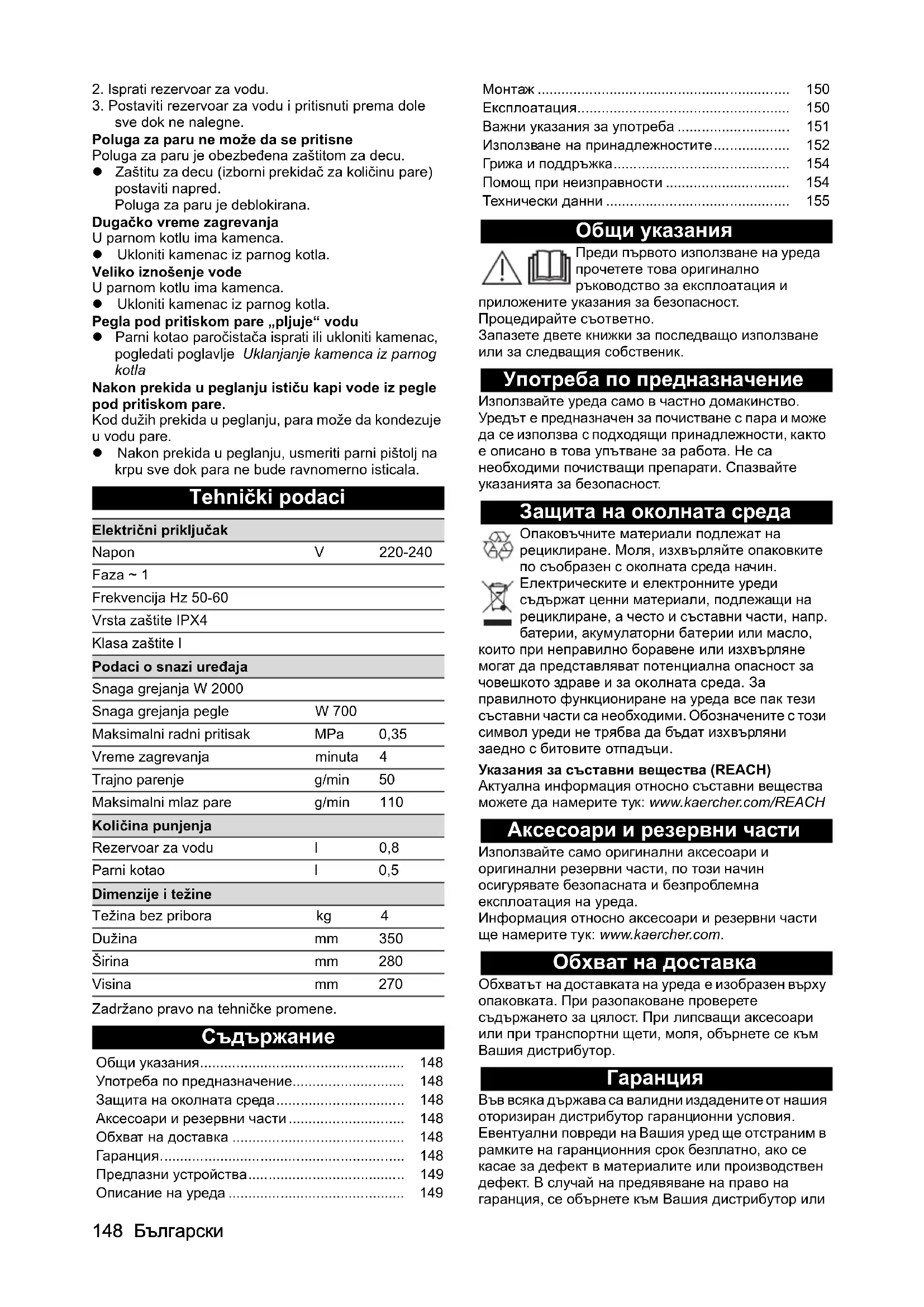 Общи указания Преди първото използване на уреда прочетете това оригинално ръководство за експлоатация и приложените указания за безопасност. Процедирайте съответно. Запазете двете книжки за последващо използване или за следващия собственик. Употреба по предназначение Използвайте уреда само в частно домакинство. Уредът е предназначен за почистване с пара и може да се използва с подходящи принадлежности, както е описано в това упътване за работа. Не са необходими почистващи препарати. Спазвайте указанията за безопасност. Защита на околната среда Опаковъчните материали подлежат на рециклиране. Моля, изхвърляйте опаковките по съобразен с околната среда начин. Електрическите и електронните уреди съдържат ценни материали, подлежащи на рециклиране, а често и съставни части, напр. батерии, акумулаторни батерии или масло, които при неправилно боравене или изхвърляне могат да представляват потенциална опасност за човешкото здраве и за ок