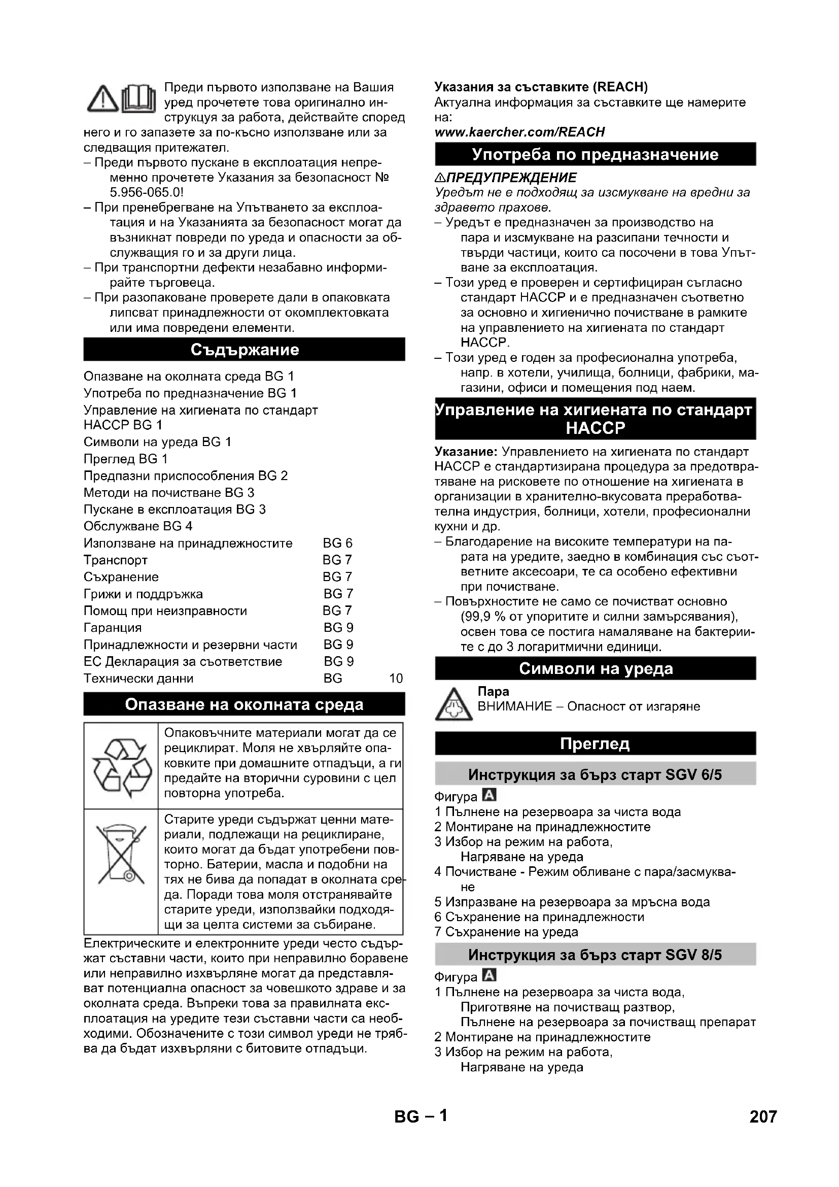 www.kaercher.com/REACH 몇 ПРЕДУПРЕЖДЕНИЕ Уредът не е подходящ за изсмукване на вредни за здравето прахове. – Уредът е предназначен за производство на пара и изсмукване на разсипани течности и твърди частици, които са посочени в това Упът- ване за експлоатация. – Този уред е проверен и сертифициран съгласно стандарт HACCP и е предназначен съответно за основно и хигиенично почистване в рамките на управлението на хигиената по стандарт HACCP. – Този уред е годен за професионална употреба, напр. в хотели, училища, болници, фабрики, ма- газини, офиси и помещения под наем. Указание: Управлението на хигиената по стандарт HACCP е стандартизирана процедура за предотвра- тяване на рисковете по отношение на хигиената в организации в хранително-вкусовата преработва- телна индустрия, болници, хотели, професионални кухни и др. – Благодарение на високите температури на па- рата на уредите, заедно в комбинация със съот- ветните аксесоари, те са особено ефективни при почистване. – Повърхностите не само се почистват основно (99,9 % от упоритите и силни замърсявания), освен това се постига намаляване на бактерии- те с до 3 логаритмични единици.